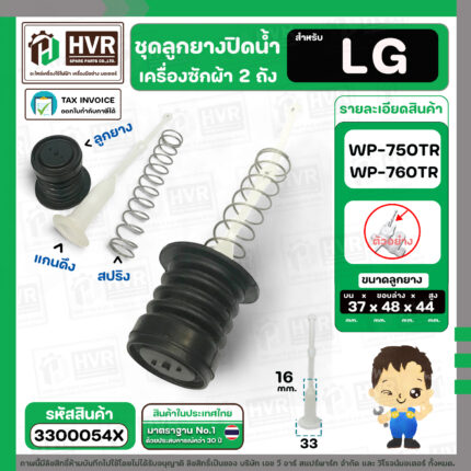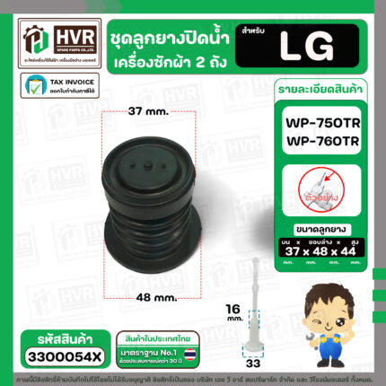 ชุดลูกยางปิดน้ำเครื่องซักผ้า LG WP-750RT , WP-760RT ( ลูกยาง + แกน + สปริง ) #3300054X ---------------------------------- >> รายละเอียดสินค้า << --------------------------------------- >> Premium Grade A (พรีเมี่ยมเกรดเอ) << >> ใช้สำหรับเป็นอะไหล่ลูกยางปิดน้ำเครื่องซักผ้า 2 ถัง >> สำหรับ ยี่ห้อ LG ( แอลจี ) รุ่น WP-750RT , WP-760RT ( เท่านั้น ) >> ในชุดประกอบไปด้วย 3 ชิ้น : ลูกยางปิดน้ำ + แกนดึงลูกยาง + สปริงดันลูกยาง ขนาดลูกยาง ด้านบน 37 mm. x ขนาด ฐานด้านล่าง 48 mm. x สูง 44 mm. ขนาดแกนดึง แกนโต 16 mm. x ฐาน 33 mm. ยาว 160 mm.