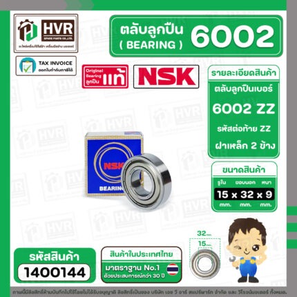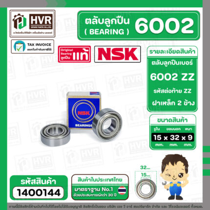 ตลับลูกปืน ( bearing ) 6002 ZZ ( ฝาเหล็ก ) ยี่ห้อ NSK คุณภาพดี มาตราฐาน JAPAN ( 15 x 32 x 9 mm. ) ( ราคา / 1 ตลับ )