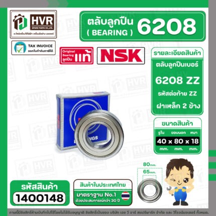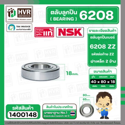 ตลับลูกปืน ( bearing ) 6208 ZZ( ฝาเหล็ก ) ยี่ห้อ NSK คุณภาพดี มาตราฐาน JAPAN( 40 x 80 x 18 mm.) ( ราคา / 1 ตลับ ) #1400148