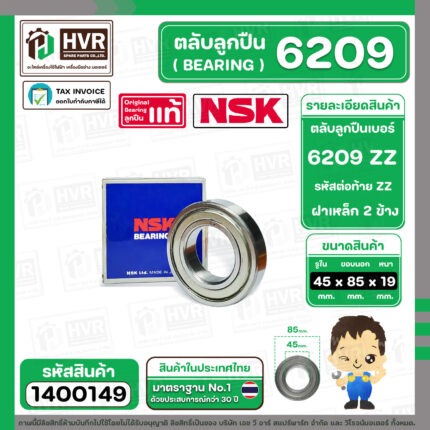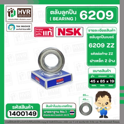ตลับลูกปืน ( bearing ) 6209 ZZ ( ฝาเหล็ก ) ยี่ห้อ NSK คุณภาพดี มาตราฐาน JAPAN ( 45 x 85 x 19 mm.)( ราคา / 1 ตลับ ) #1400149