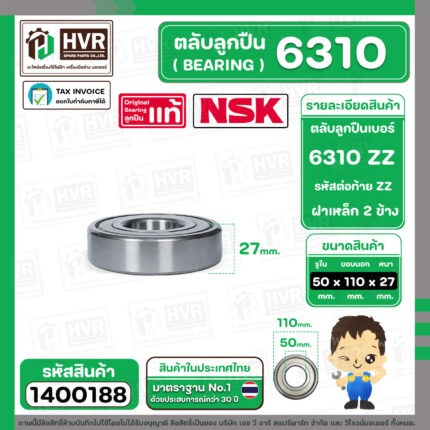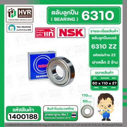 ตลับลูกปืน ( bearing ) 6310 ZZ ( ฝาเหล็ก ) ยี่ห้อ NSK คุณภาพดี มาตราฐาน JAPAN ( 50 x 110 x 27 mm.) ( ราคา / 1 ตลับ ) #1400188