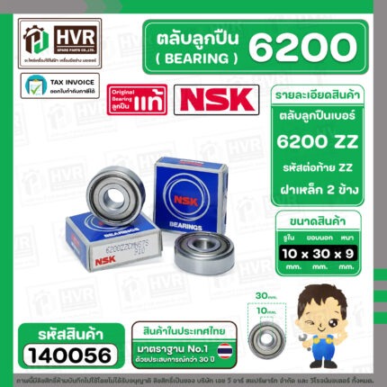 ตลับลูกปืน ( bearing ) 6200 ZZ ( ฝาเหล็ก ) ยี่ห้อ NSK คุณภาพดี มาตราฐาน JAPAN ( 10 x 30 x 9 mm. ) ( ราคา / 1 ตลับ ) #140056