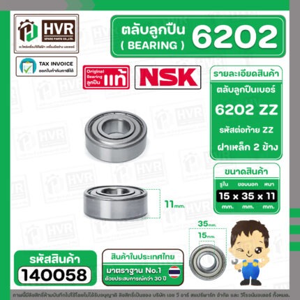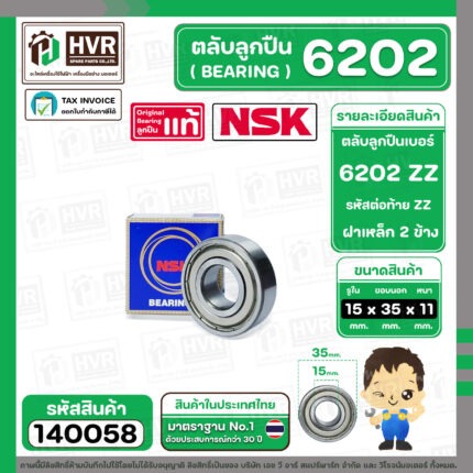 ตลับลูกปืน ( bearing ) 6202 ZZ ( ฝาเหล็ก ) ยี่ห้อ NSK คุณภาพดี มาตราฐาน JAPAN ( 15 x 35 x 11 mm. ) ( ราคา / 1 ตลับ )