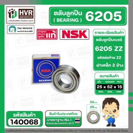 ตลับลูกปืน ( bearing ) 6205 ZZ( ฝาเหล็ก ) ยี่ห้อ NSK คุณภาพดี มาตราฐาน JAPAN ( 25 x 52 x 15 mm. ) ( ราคา / 1 ตลับ ) #140068