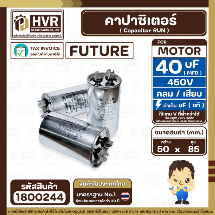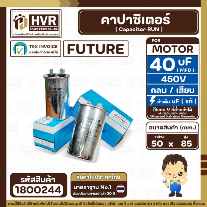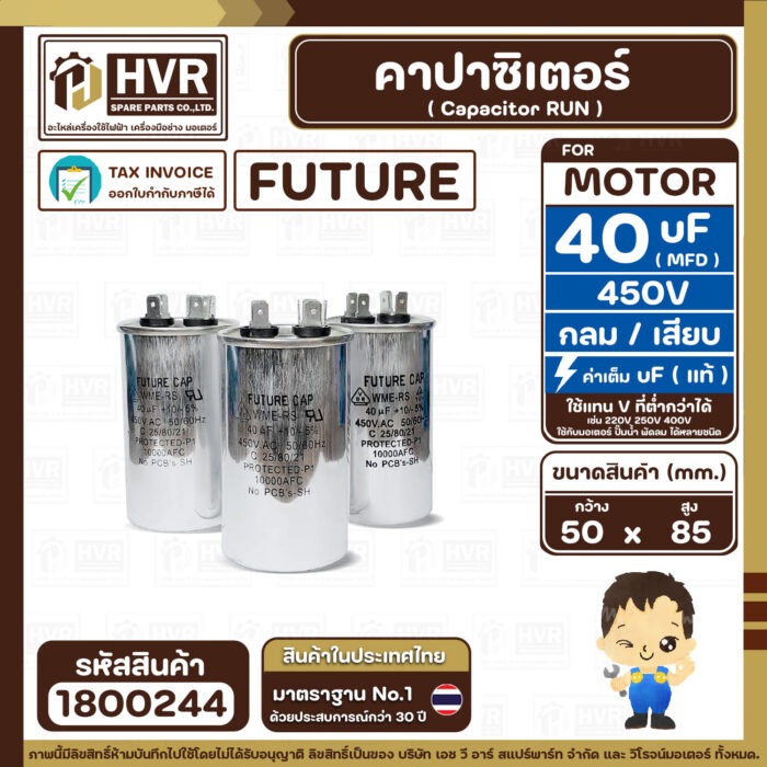 คาปาซิเตอร์ ( Cap Run ) 40 uF 450V ( อลูมิเนียม ) ( กลม เสียบ ) ( FUTURE ) ( 50 x 85 mm.) ( 1 ตัว ) #1800244