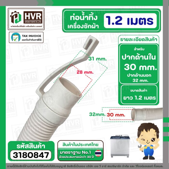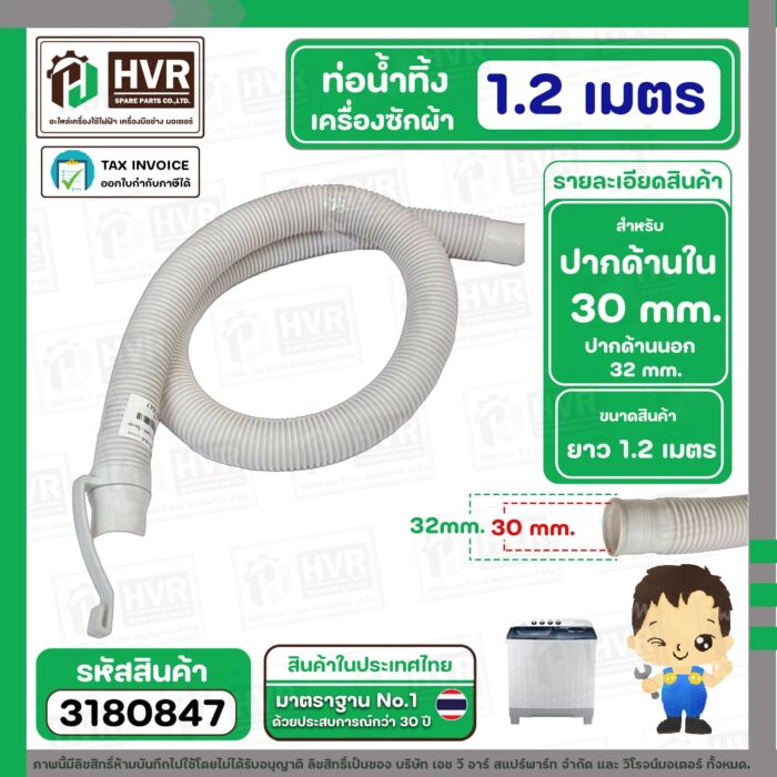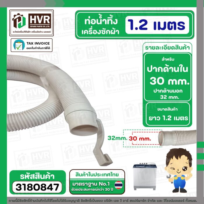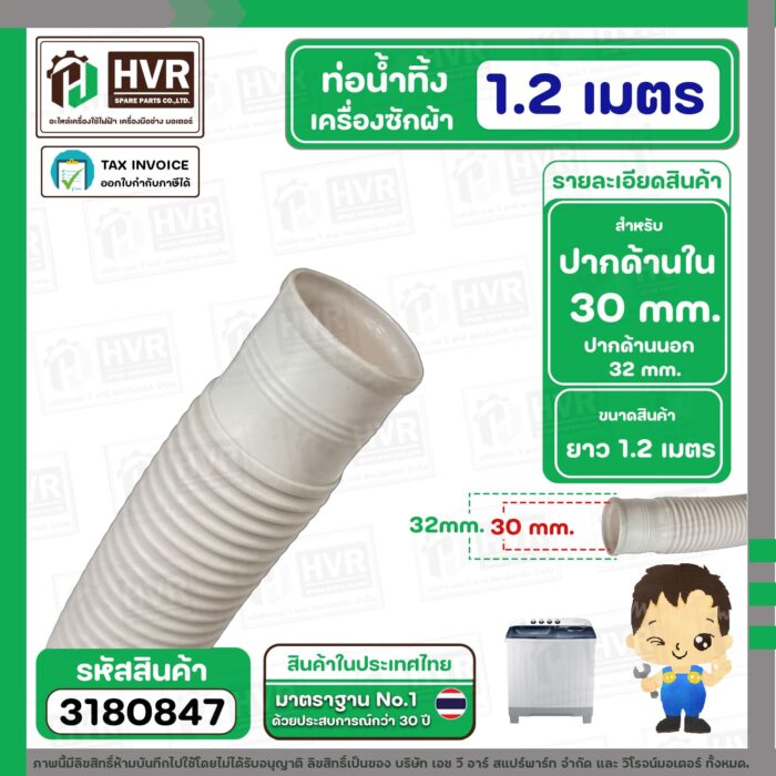 ท่อน้ำทิ้ง เครื่องซักผ้า ทั่วไป ปากท่อด้านใน 30 mm. ยาว 1.2 เมตร ( มีตะขอเกี่ยวยาว ) #3180847