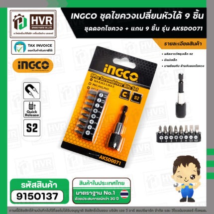 ชุดดอกไขควงเปลี่ยนหัวได้ 9 ชิ้น ( INGCO ) #AKSD0071 #9150137