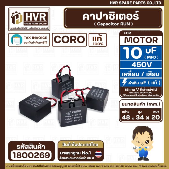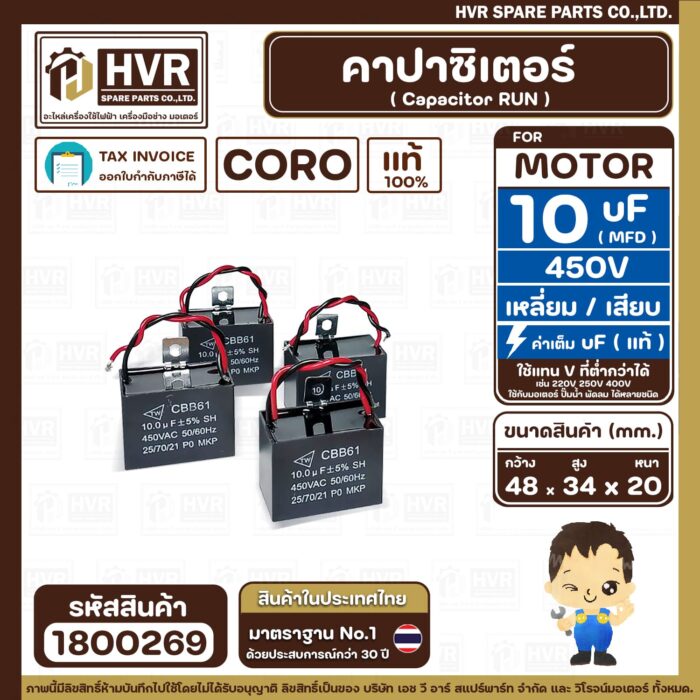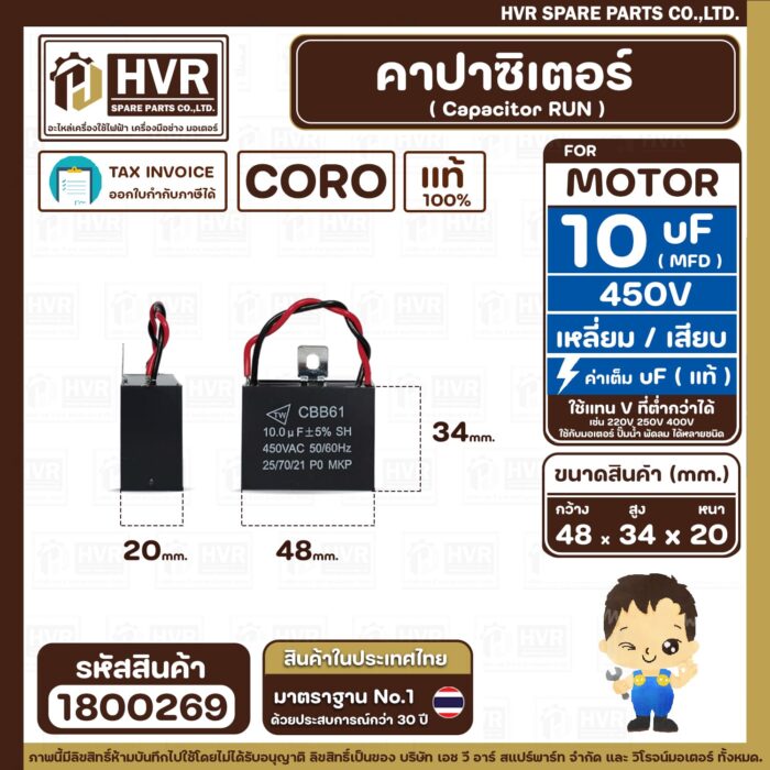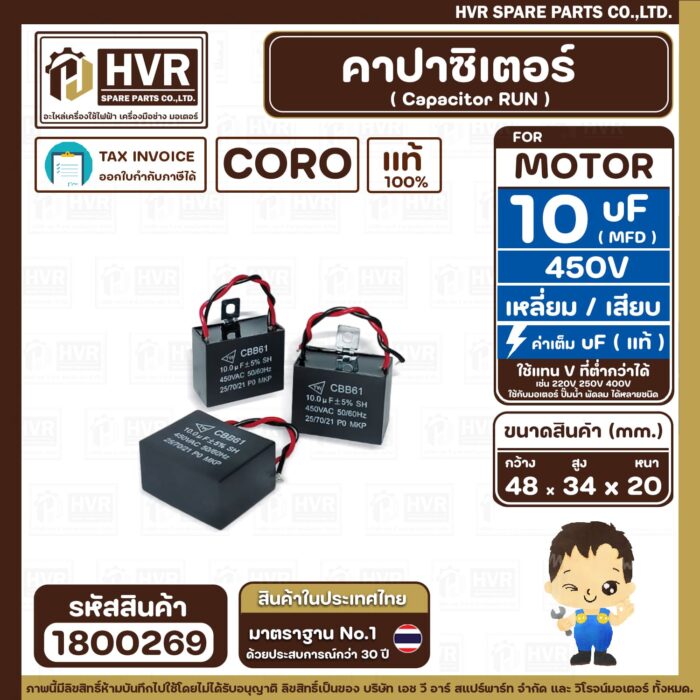 คาปาซิเตอร์ พัดลม ( Cap Run ) 10 uF 450V ( เหลี่ยม สาย ) ( TW ) ( 33 x 47 x 26 mm.) ( 1 ตัว ) #1800269