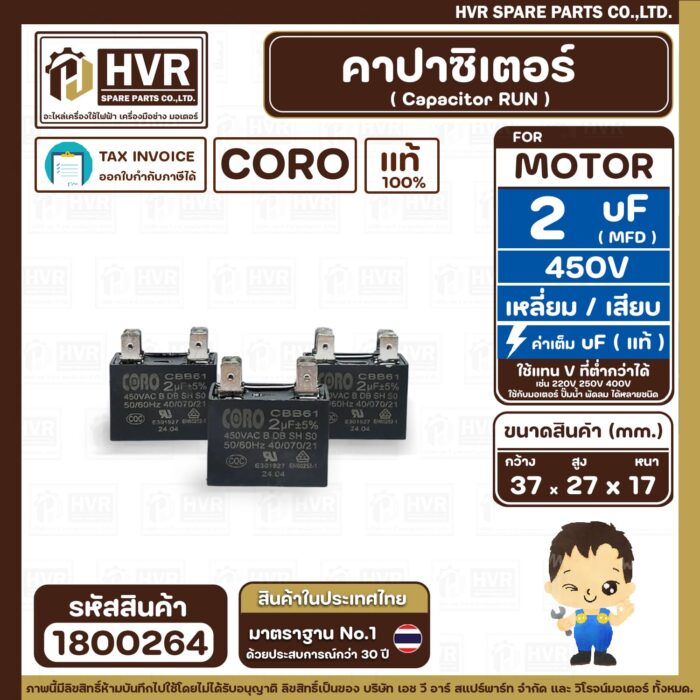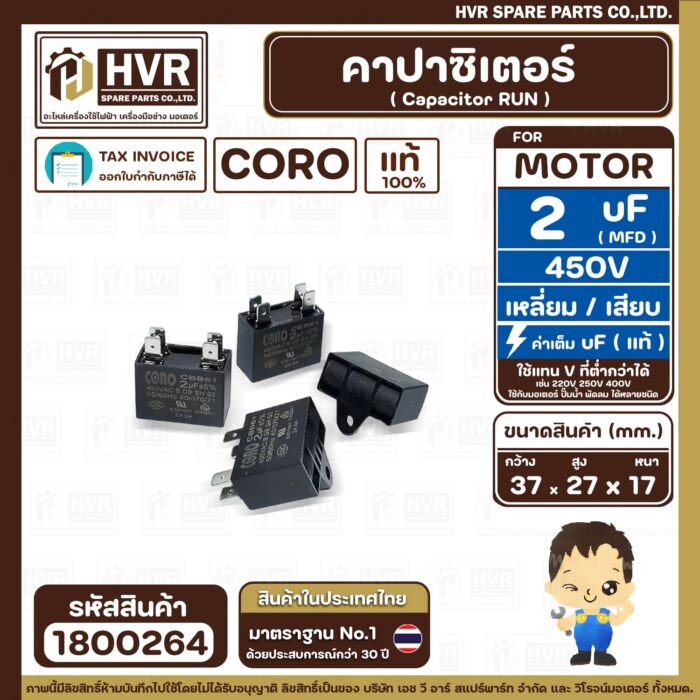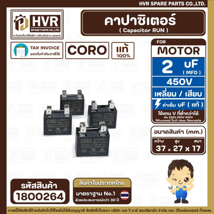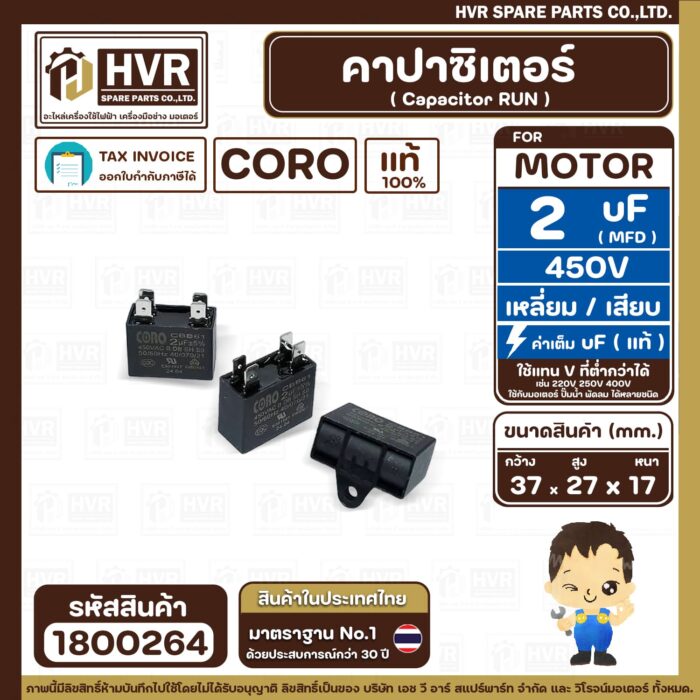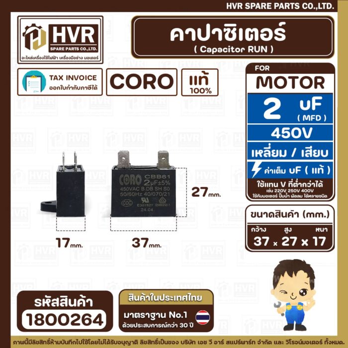 คาปาซิเตอร์ พัดลม ( Cap Run ) 2 uF 450V ( เหลี่ยม เสียบ 4 ขา ) ( CORO ) ( 27 x 37 x 17 mm.) ( 1 ตัว ) #1800264