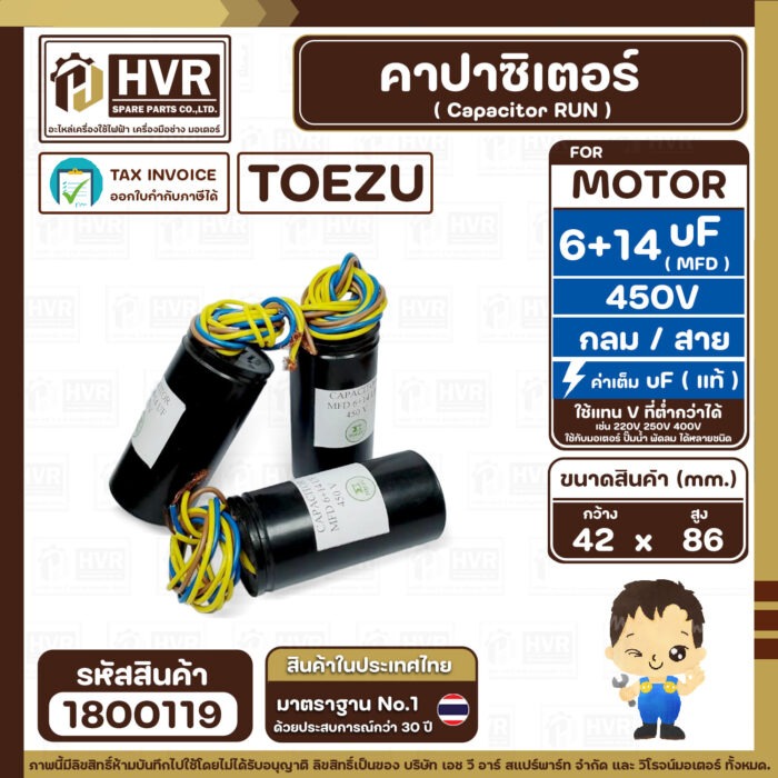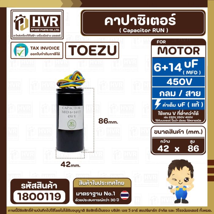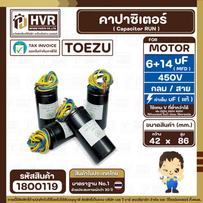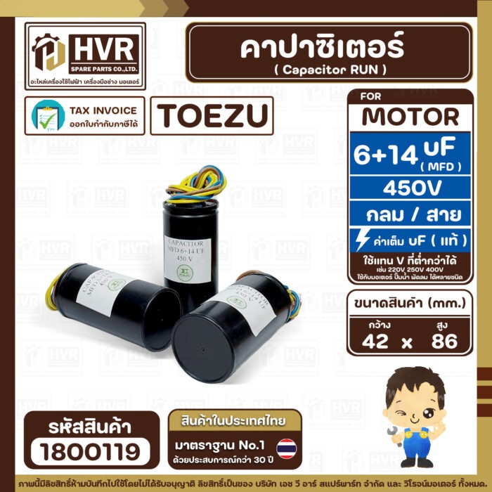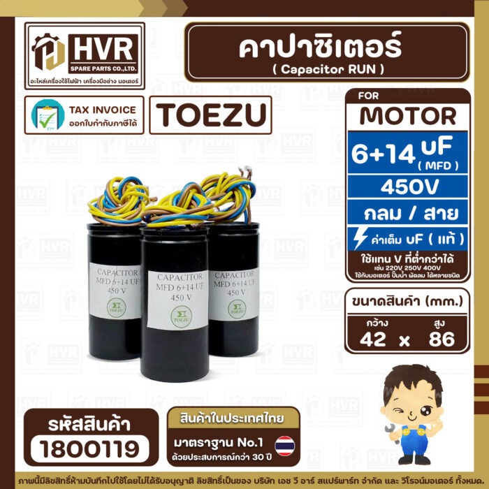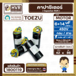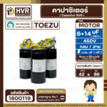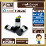 คาปาซิเตอร์ (Cap) เครื่องซักผ้า 6 + 14 uF ( MFD ) 450V ( TOEZU ) ( พลาสติก สีดำ กลม สาย ) ( 42 x 86 mm. ) #1800119