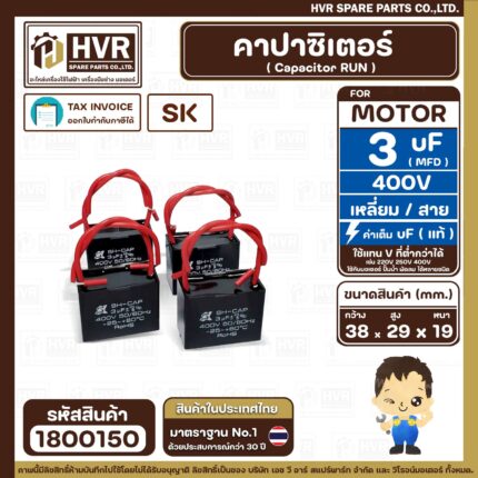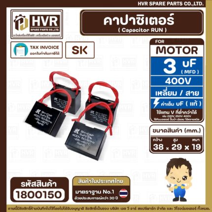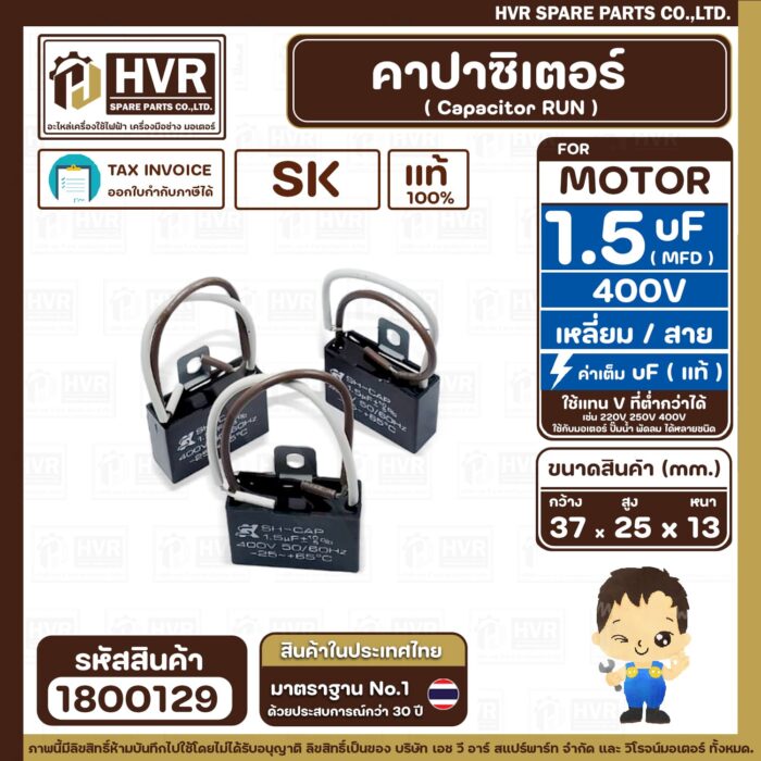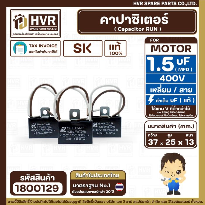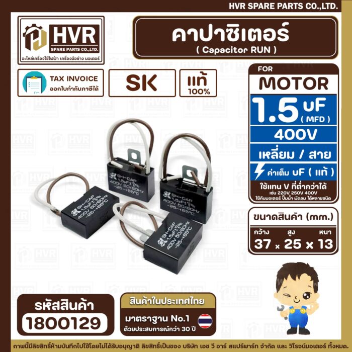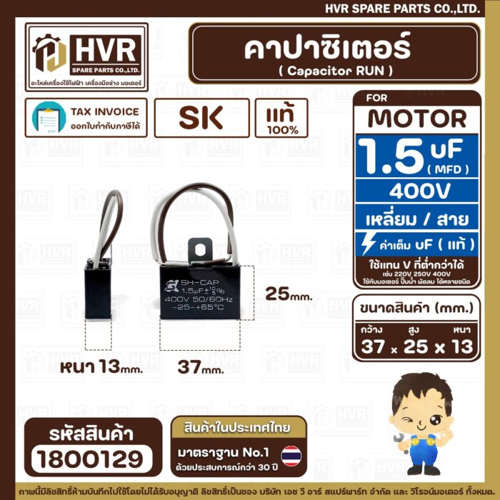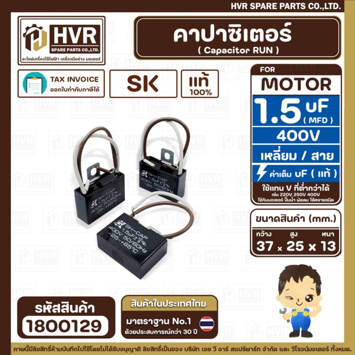 คาปาซิเตอร์ ( Cap Run ) 1.5 uF 400V ( เหลี่ยม สาย ) ( SK ) ( 25 x 37 x 13 mm.) ( แท้ ) ( 1 ตัว )