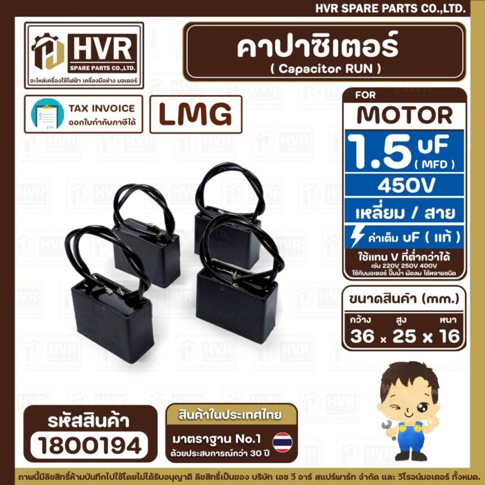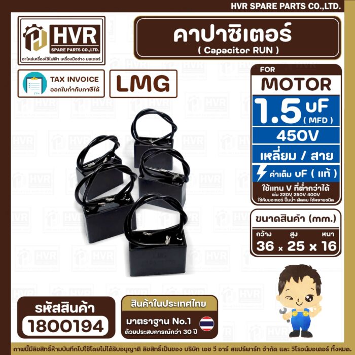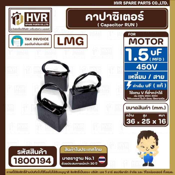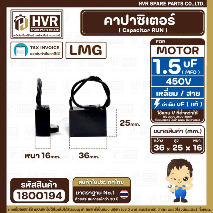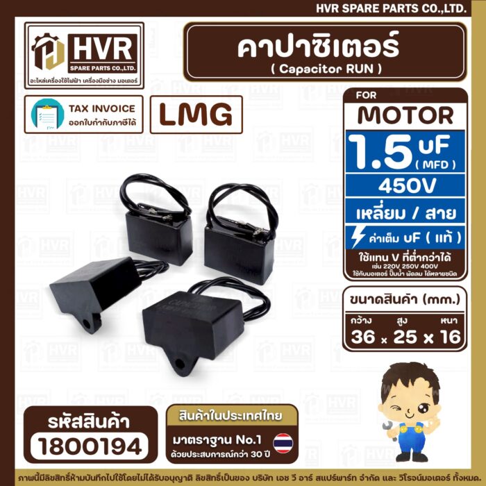 คาปาซิเตอร์ ( Cap Run ) 1.5 uF 450V ( เหลี่ยม สาย ) ( LMG ) ( 36 x 25 x16 mm.) ( 1 ตัว ) #1800194