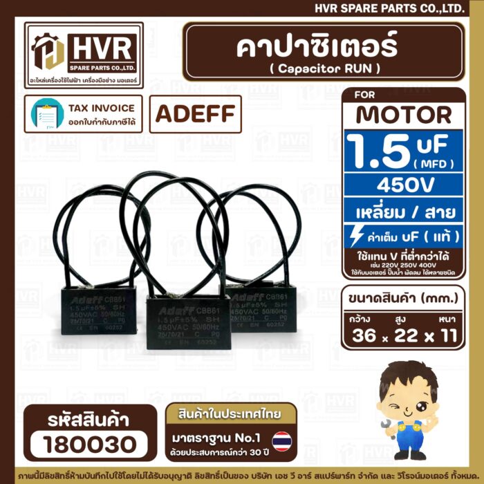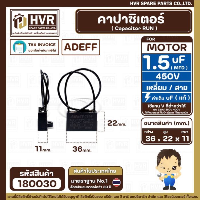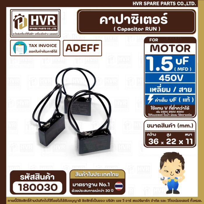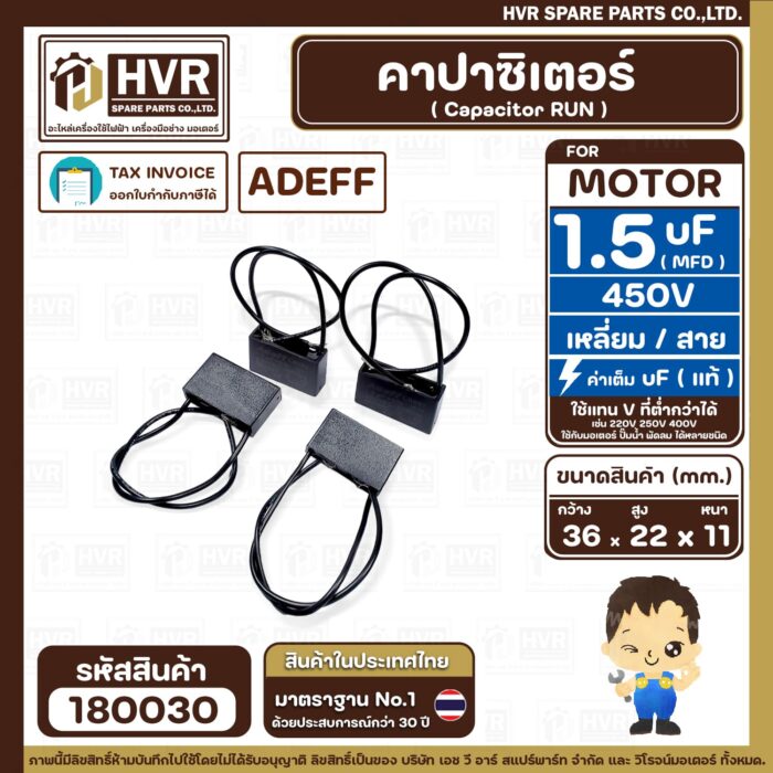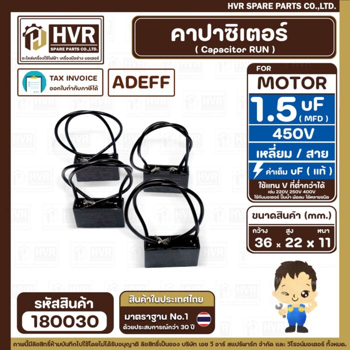 คาปาซิเตอร์ ( Cap Run ) 1.5 uF 450V ( เหลี่ยม สาย ) ( Adeff ) ( 22 x 36 x 11 mm.) ( 1 ตัว ) #180030