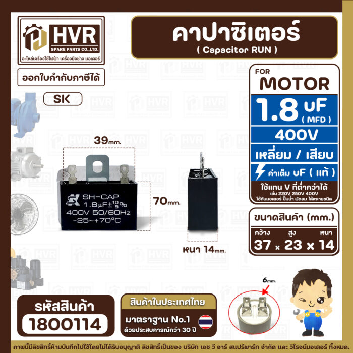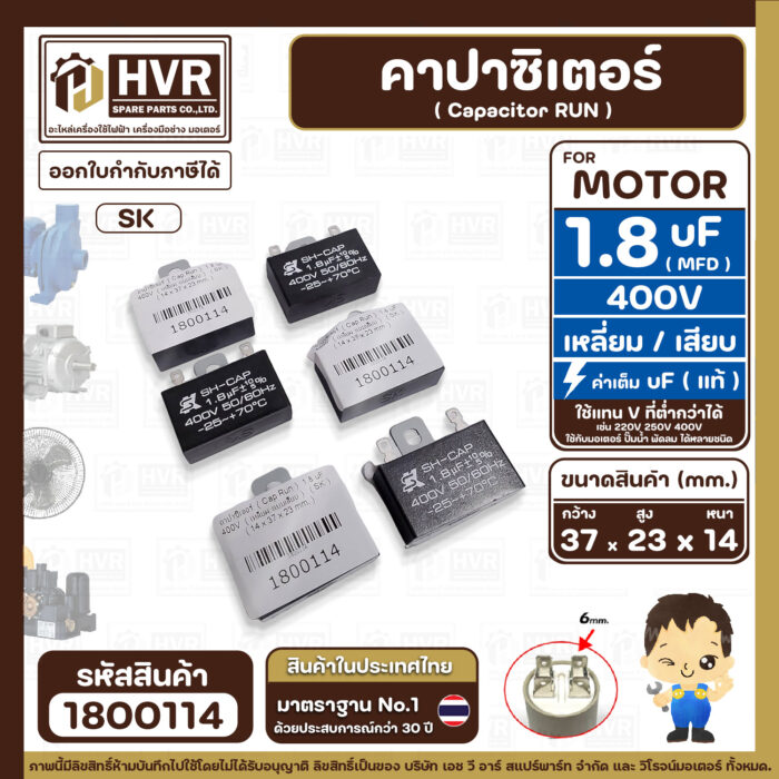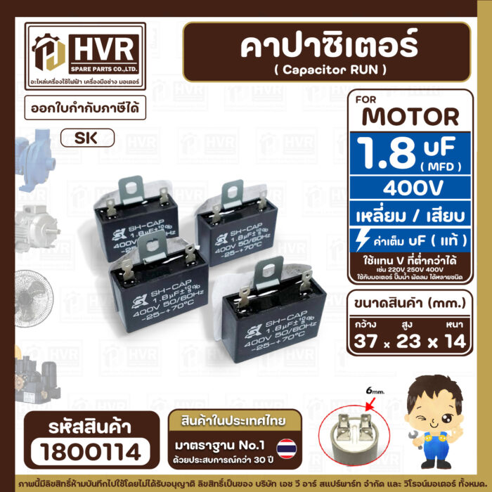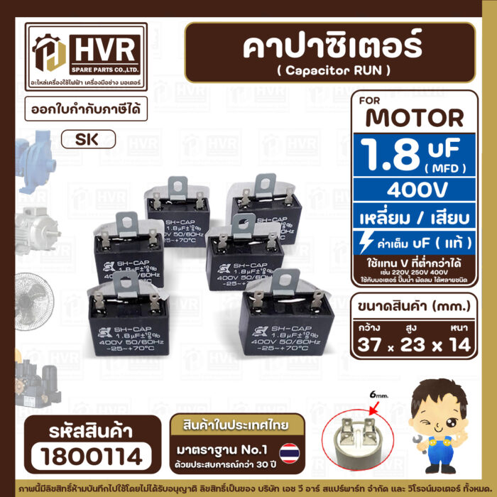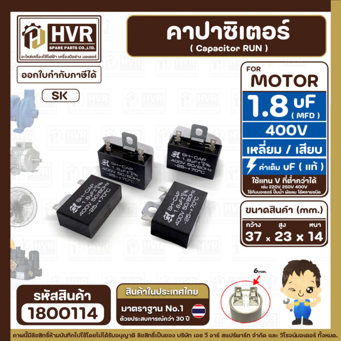 คาปาซิเตอร์พัดลมฮาตาริ ( Capacitor Run ) 1.8 uF ( MFD ) 400V ยี่ห้อ SK ( แท้ ) ( เหลี่ยม แบบเสียบ 2 ขั่ว ) #1800114