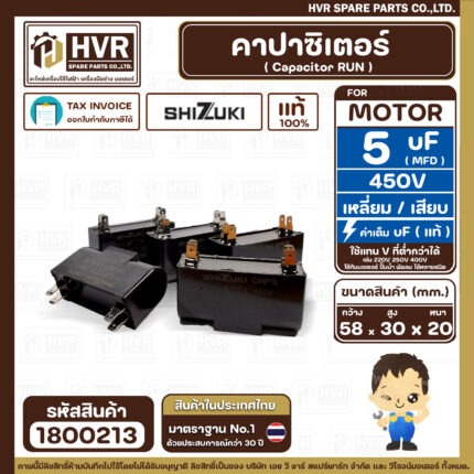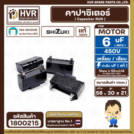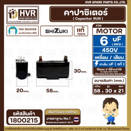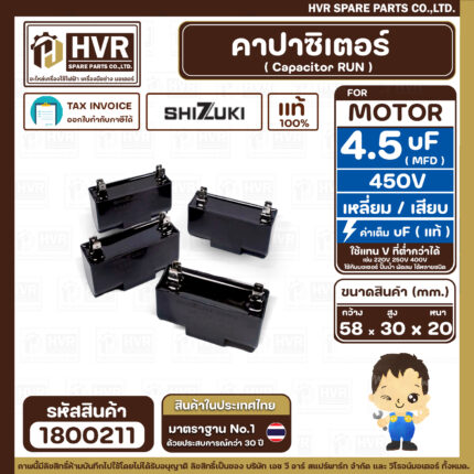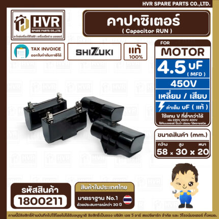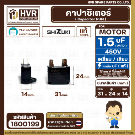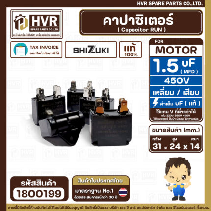 คาปาซิเตอร์ ( Capacitor Run ) SHIZUKI 1.5 uF (MFD ) 450V ( เหลี่ยม แบบเสียบ 4 ขั่ว ) ( แท้ ) (14x24x31 mm.) #1800199