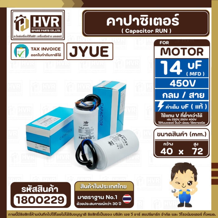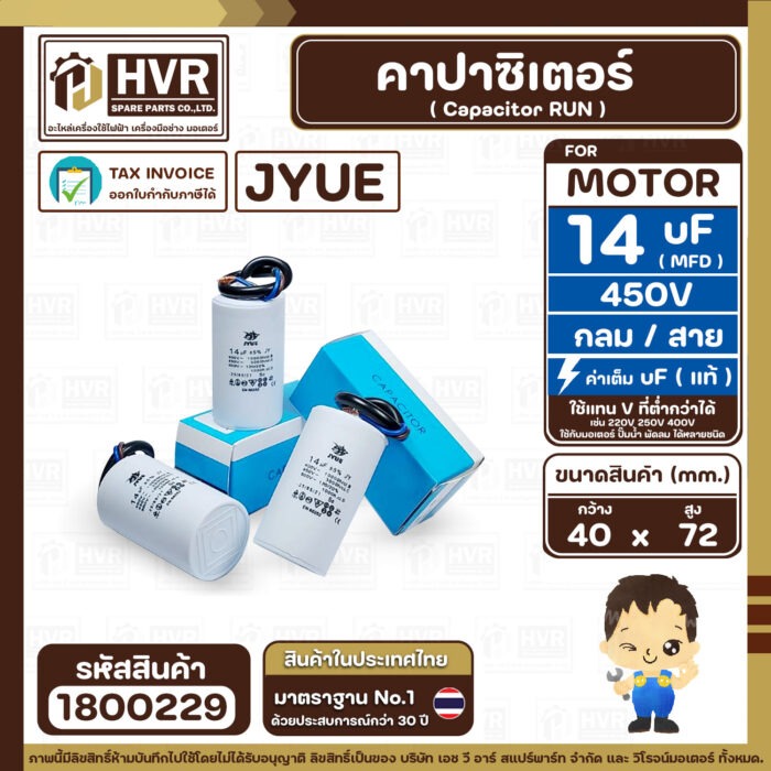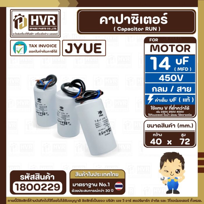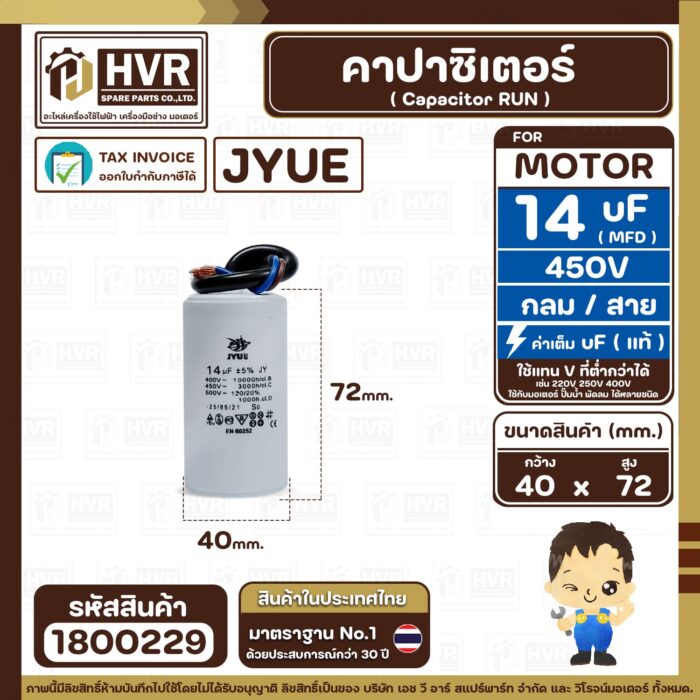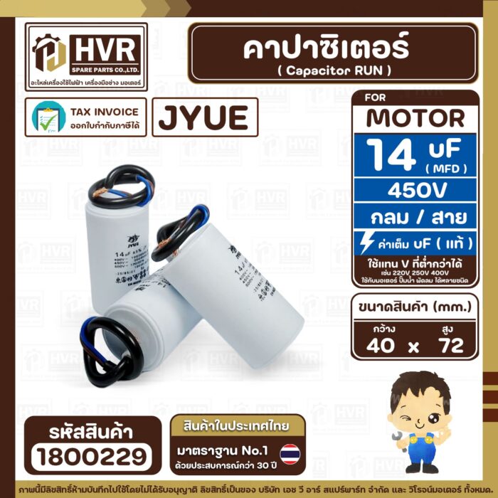 คาปาซิเตอร์ ( Cap Run ) 14 uF ( MFD ) 450V ( กลม สาย ) ( JYUE ) ( 40 x 72 mm.) #1800229