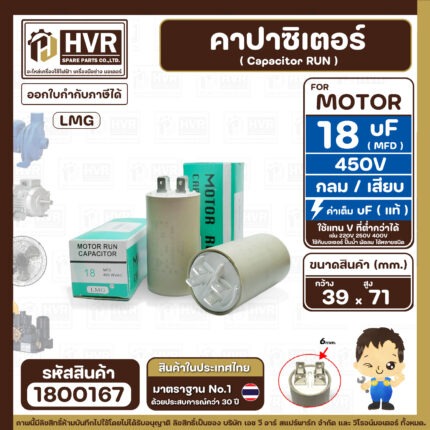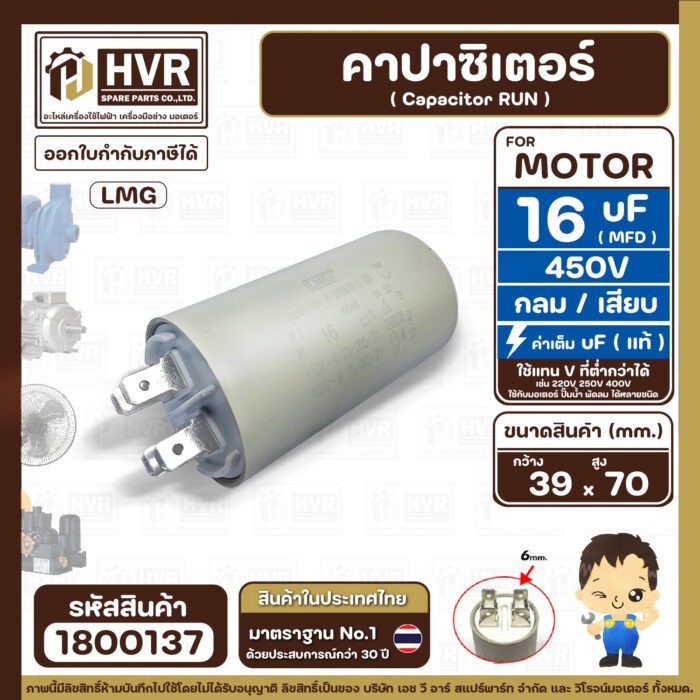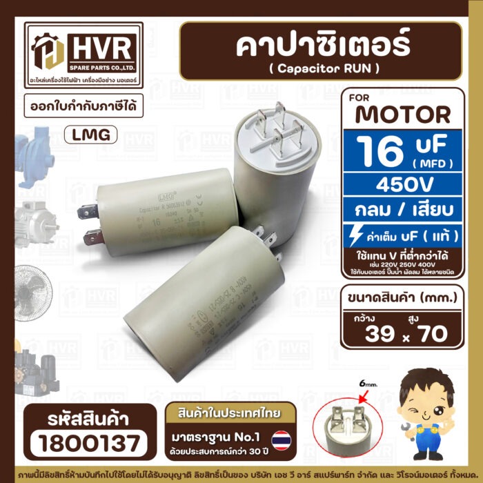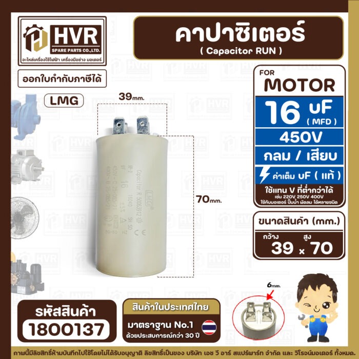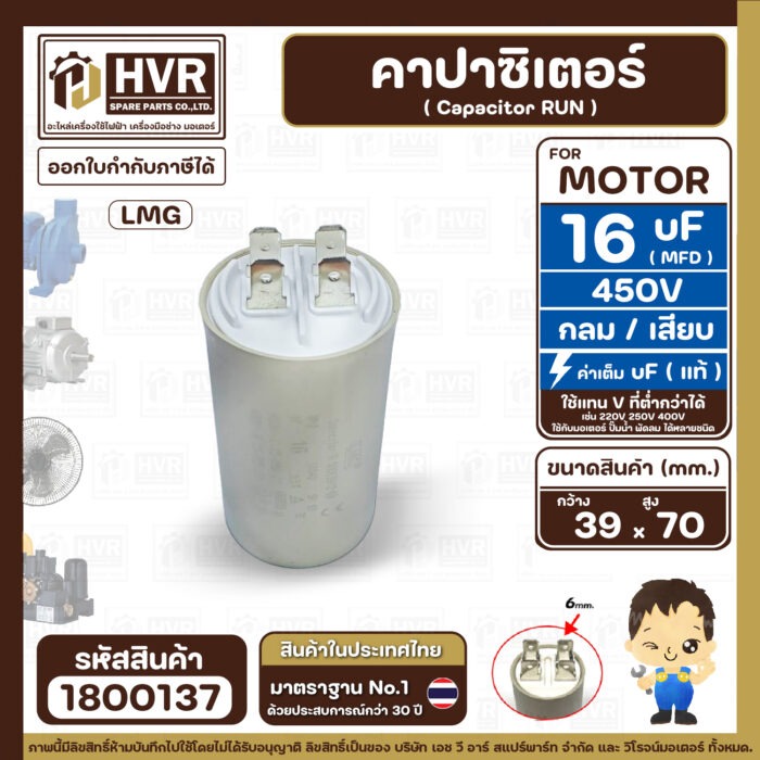 คาปาซิเตอร์ ( Cap Run ) 16 uF 450V ( กลม แบบเสียบ ) ( LMG ) ( 39 x 70 mm. ) ( 1 ตัว ) #1800137