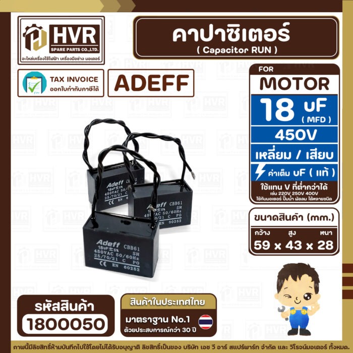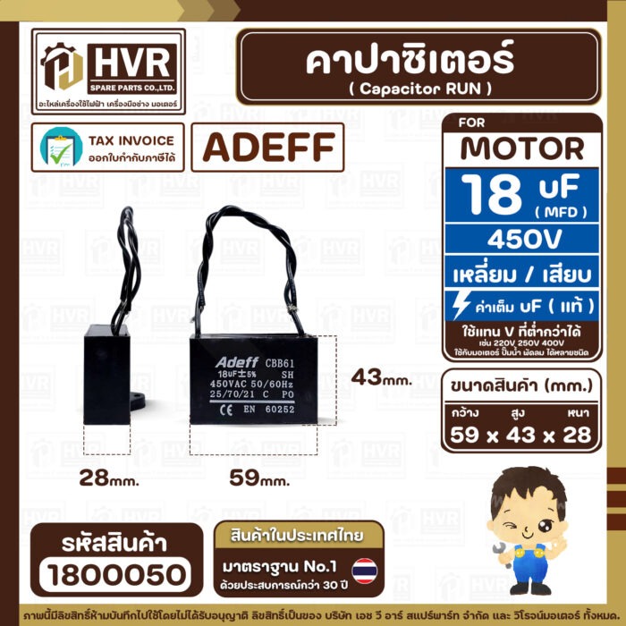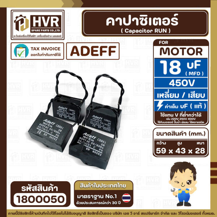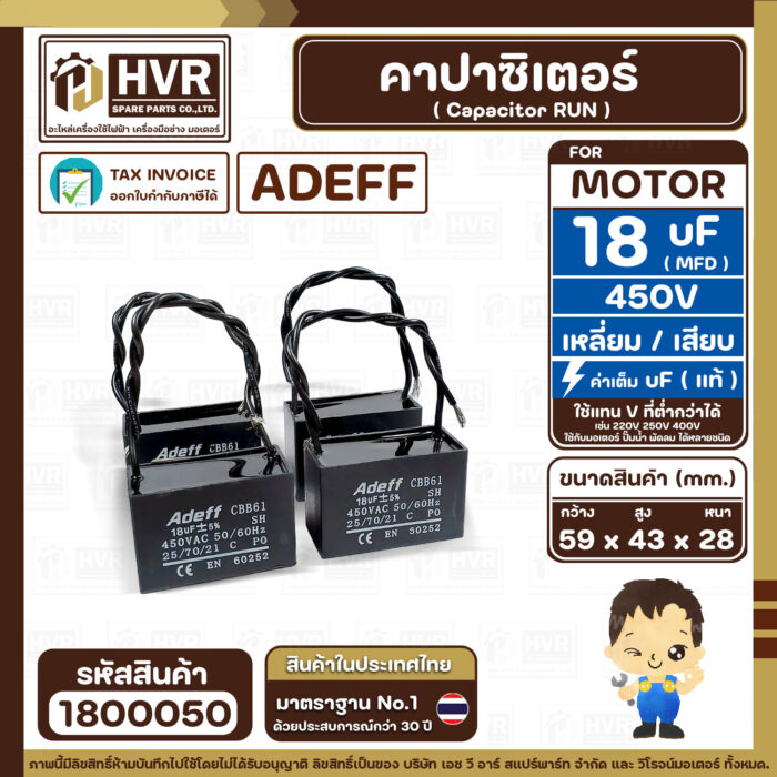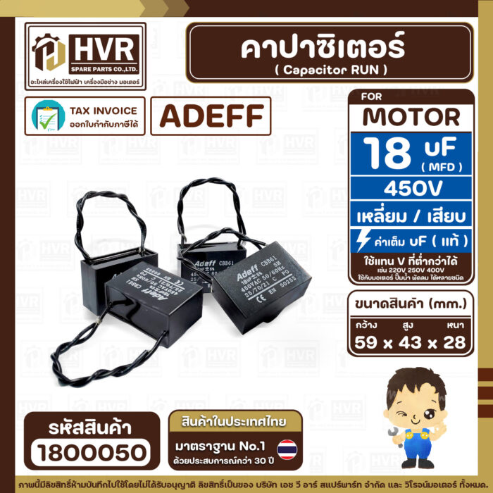คาปาซิเตอร์ ( Cap Run ) 18 uF 450V ( เหลี่ยม สาย ) ( Adeff ) ( 43 x 59 x 28 mm.) ( 1 ตัว )