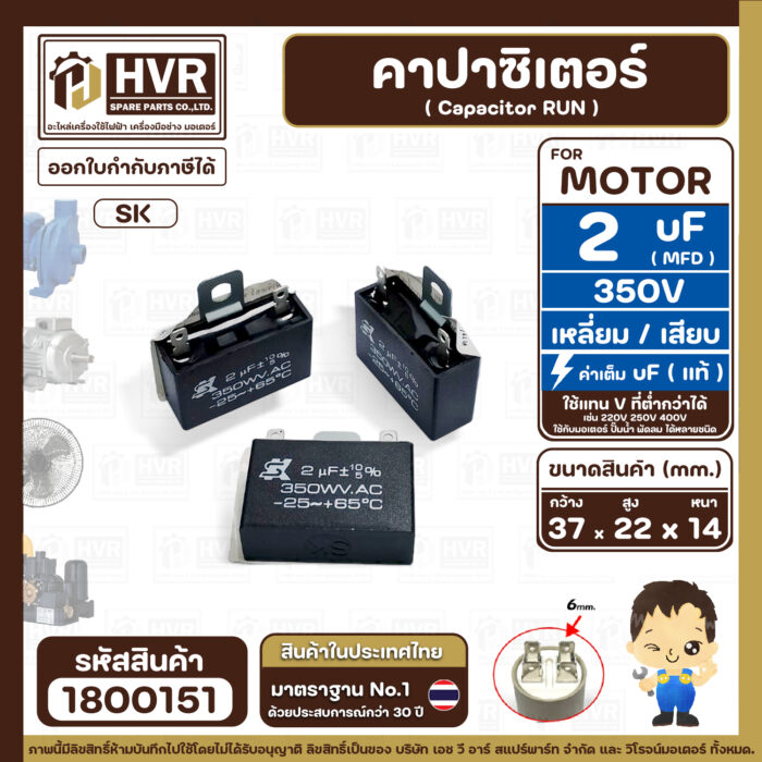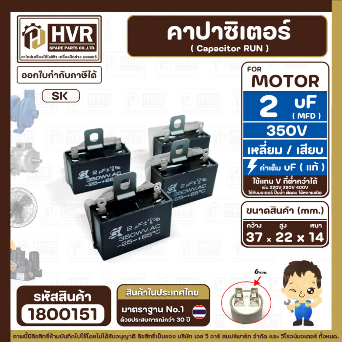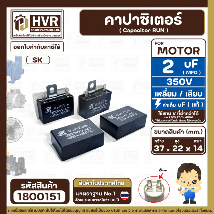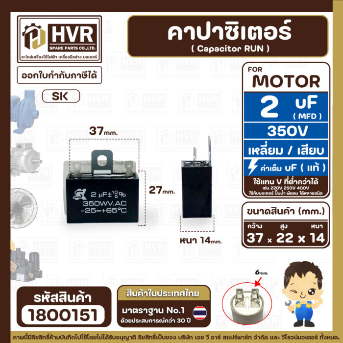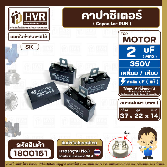 คาปาซิเตอร์พัดลมฮิตาริ ( Capacitor Run ) 2 uF ( MFD ) 350V ยี่ห้อ SK ( แท้ ) ( เหลี่ยม แบบเสียบ 2 ขั่ว ) #1800151
