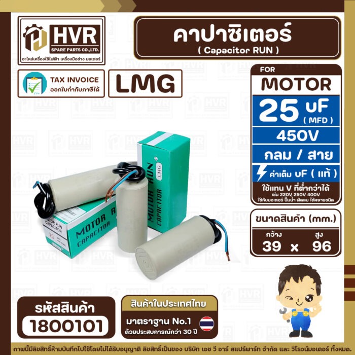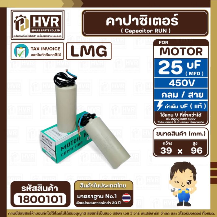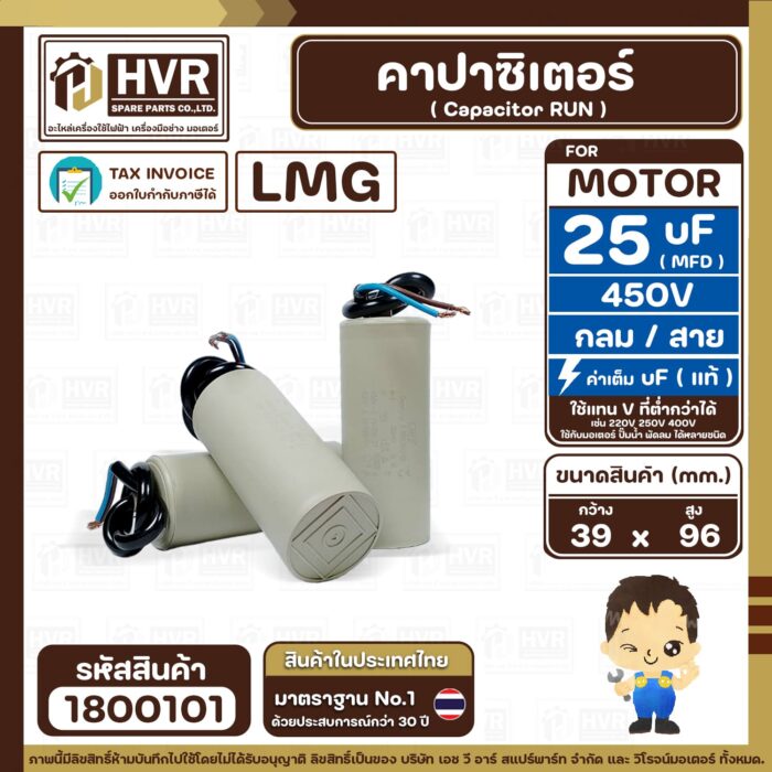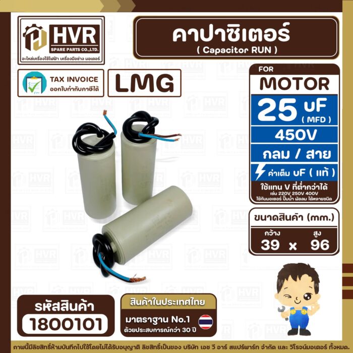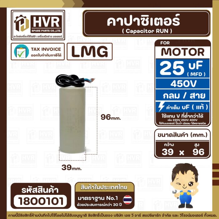 คาปาซิเตอร์ ( Cap Run ) 25 uF 450V ( กลม สาย ) ( LMG ) ( 39 x 96 mm.) ( 1 ตัว ) #1800101