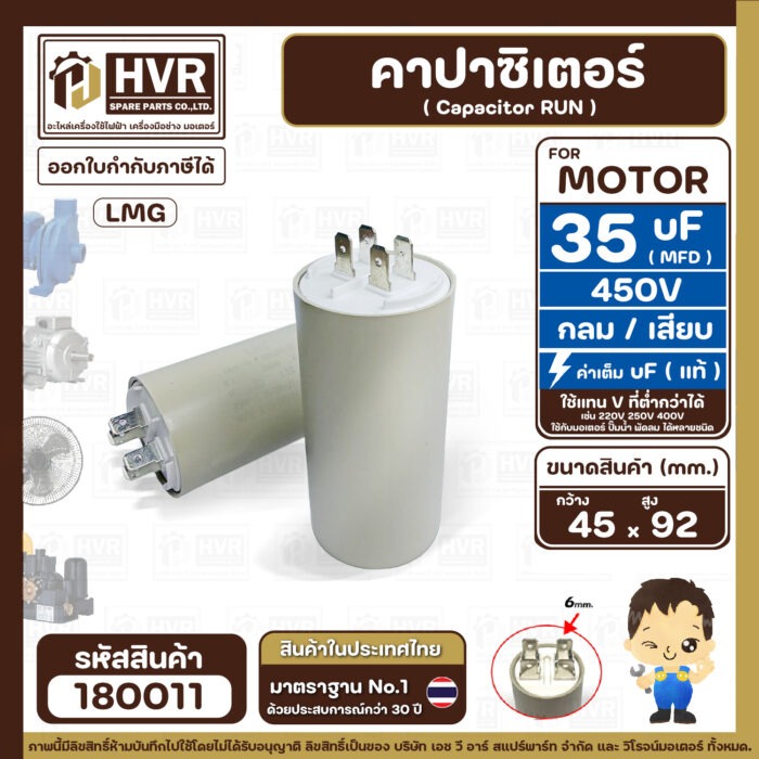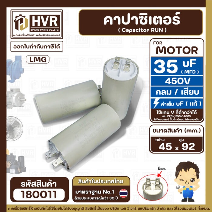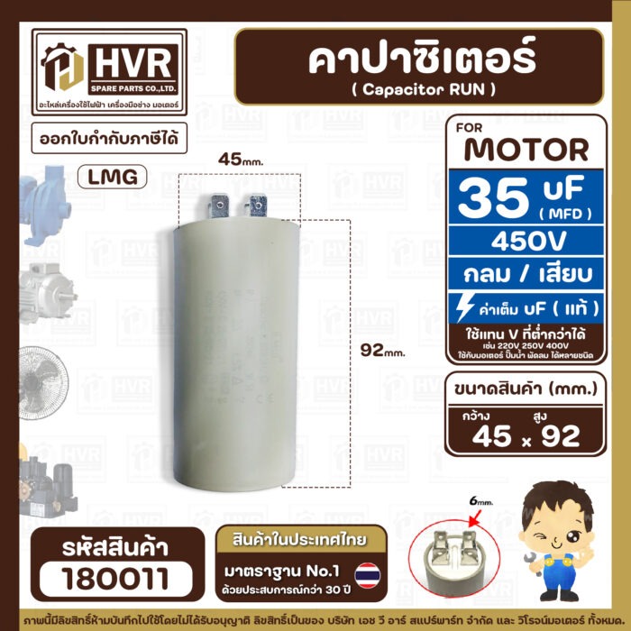 คาปาซิเตอร์ ( Cap Run ) 35 uF 450V ( กลม แบบเสียบ ) ( LMG ) ( 45 x 92 mm. ) ( 1 ตัว ) #180011