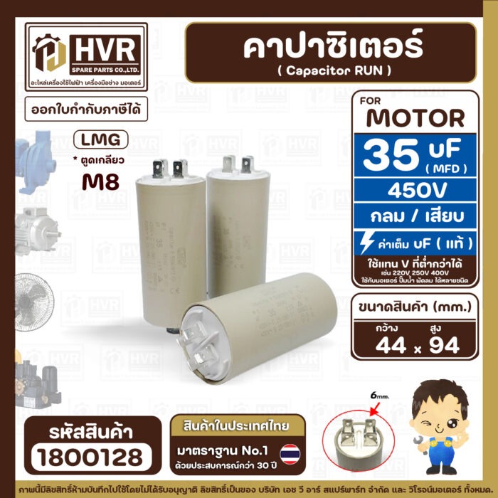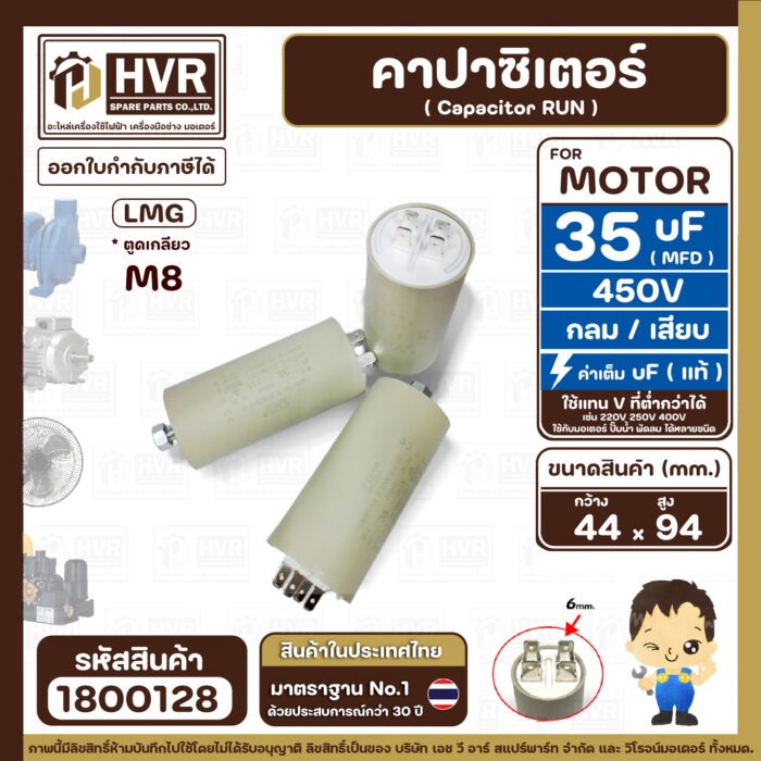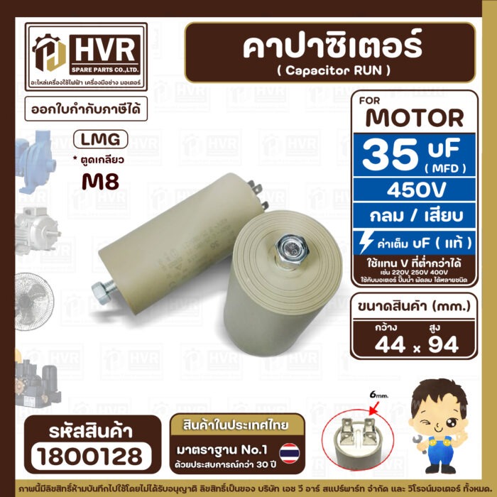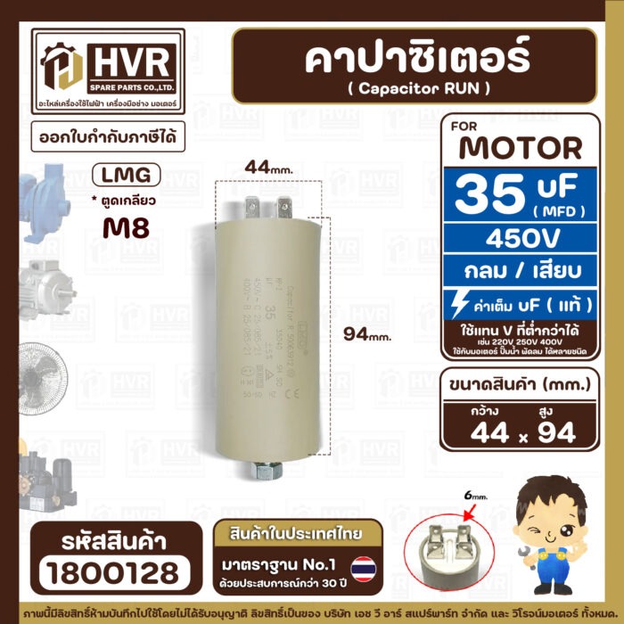 คาปาซิเตอร์ ( Cap Run ) 35 uF ( MFD ) 450V ( ตูดเกลียว M8 กลม แบบเสียบ ) ( LMG ) ( 44 x 94 mm. ) #1800128