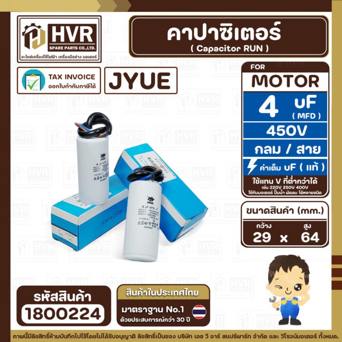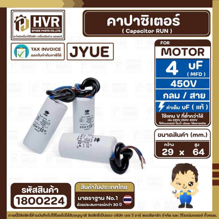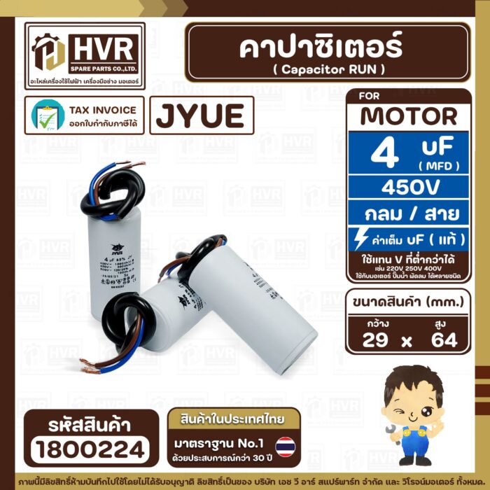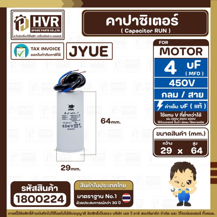 คาปาซิเตอร์ ( Cap Run ) 4 uF 450V ( กลม สาย ) ( JYUE ) ( 29 x 64 mm.) ( 1 ตัว ) #1800224
