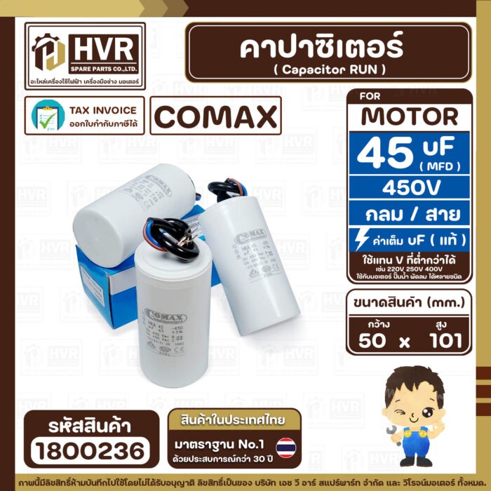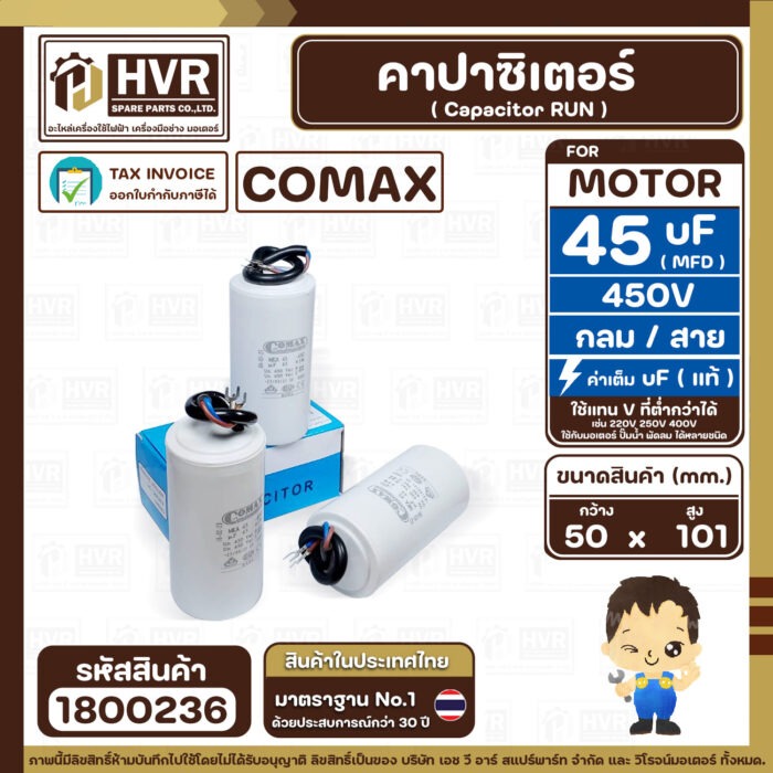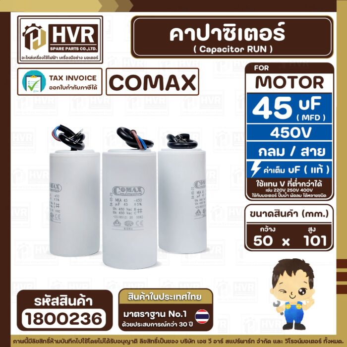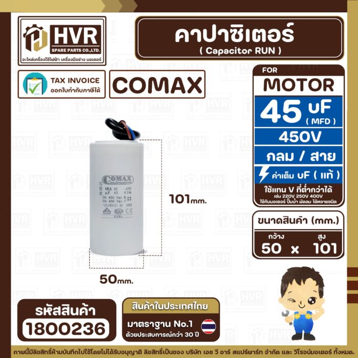 คาปาซิเตอร์ ( Cap Run ) 45 uF 450V ( กลม สาย ) ( COMAX ) ( CBB65 )( 50 x 101 mm.) ( 1 ตัว )