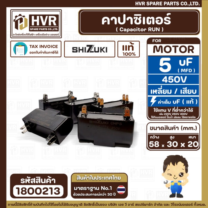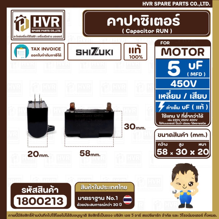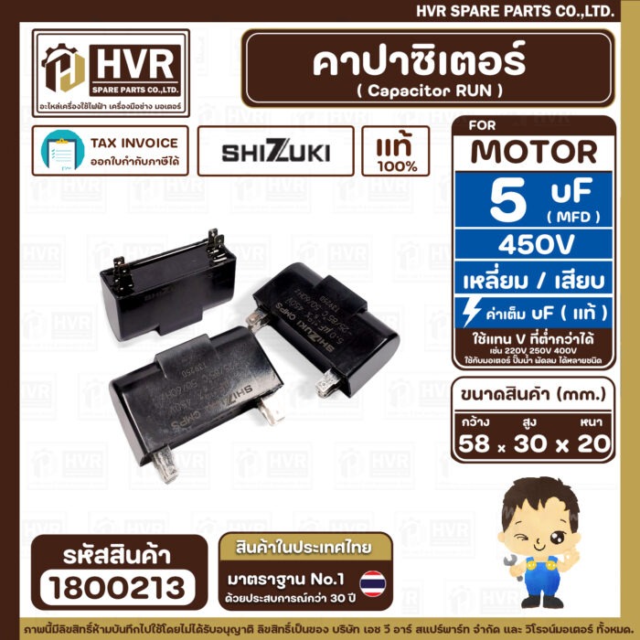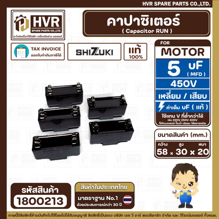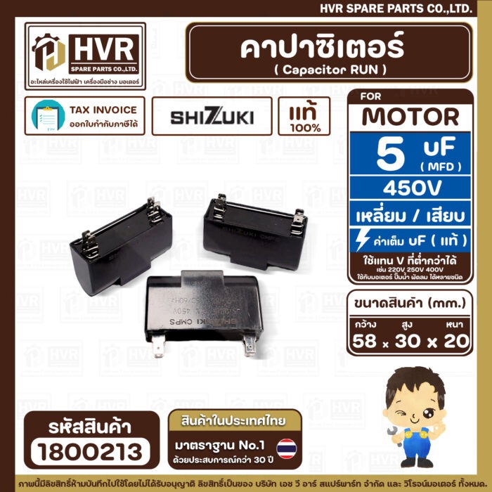 คาปาซิเตอร์ ( Cap Run ) 5 uF 450V ( เหลี่ยม เสียบ 4 ขา ) ( SHIZUKI ) ( แท้ ) ( 20 x 30 x 58 mm. ) ( 1 ตัว )