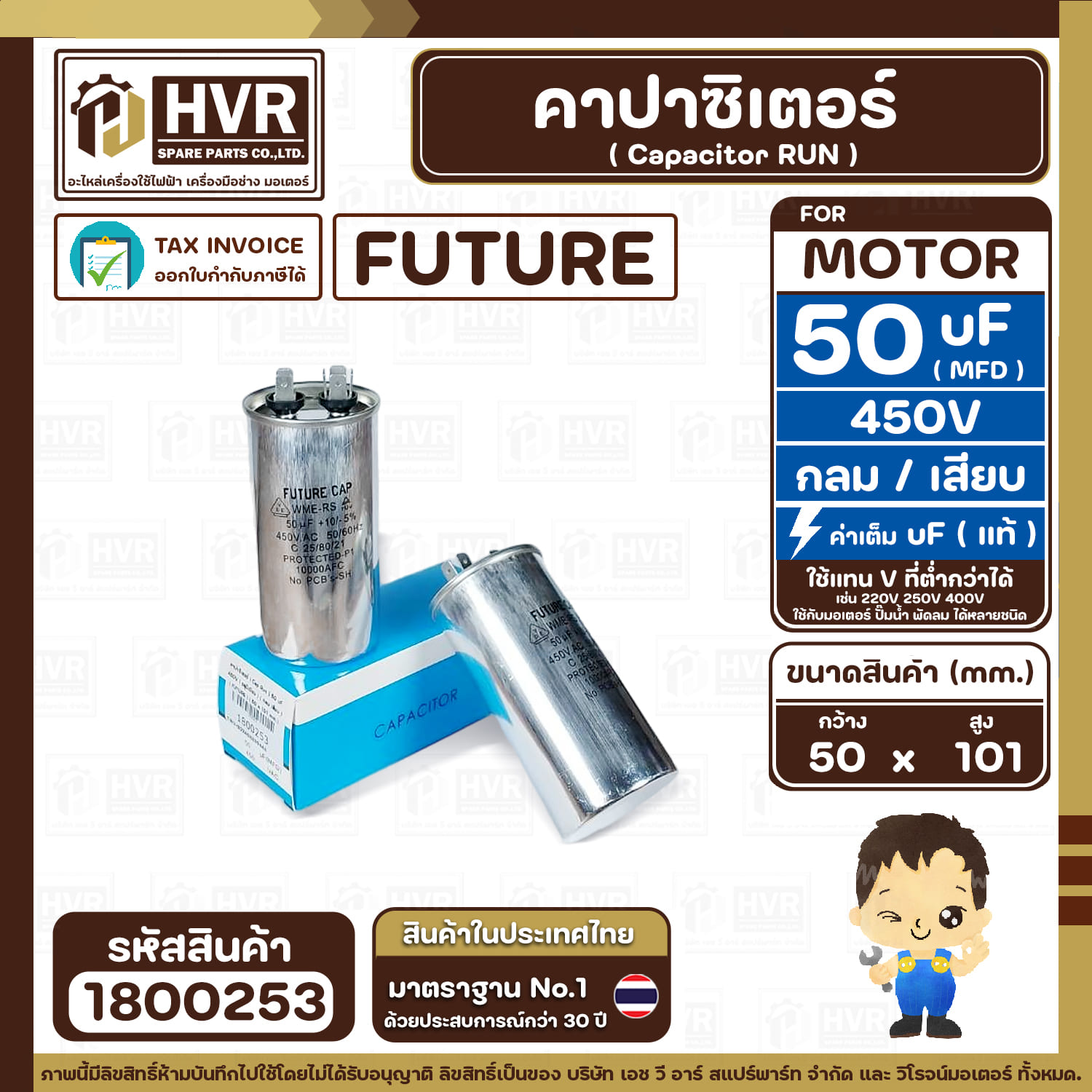 คาปาซิเตอร์ ( Cap Run ) 50 uF 450V ( อลูมิเนียม ) ( กลม เสียบ ) ( FUTURE ) ( 50 x 101 mm.) ( 1 ตัว ) #1800253