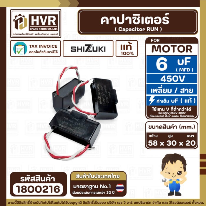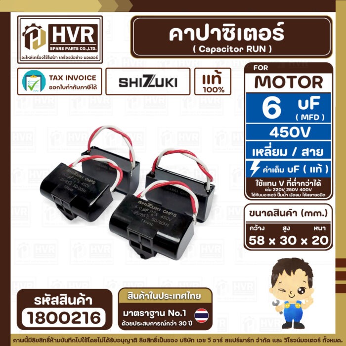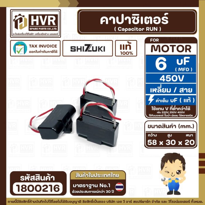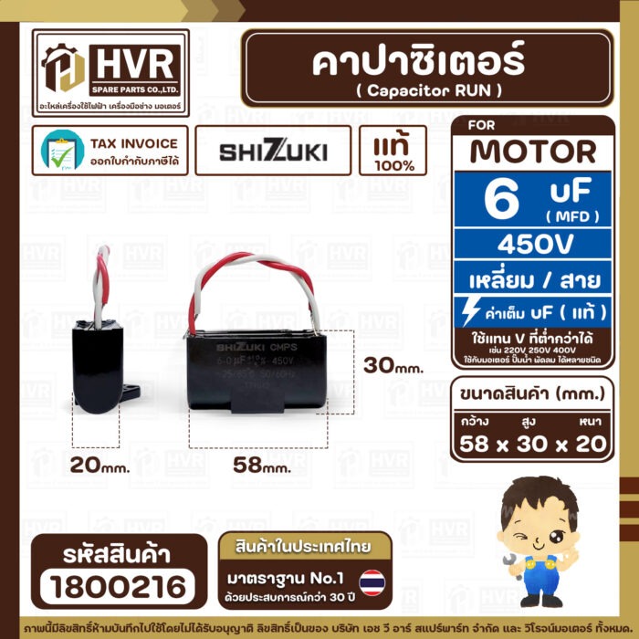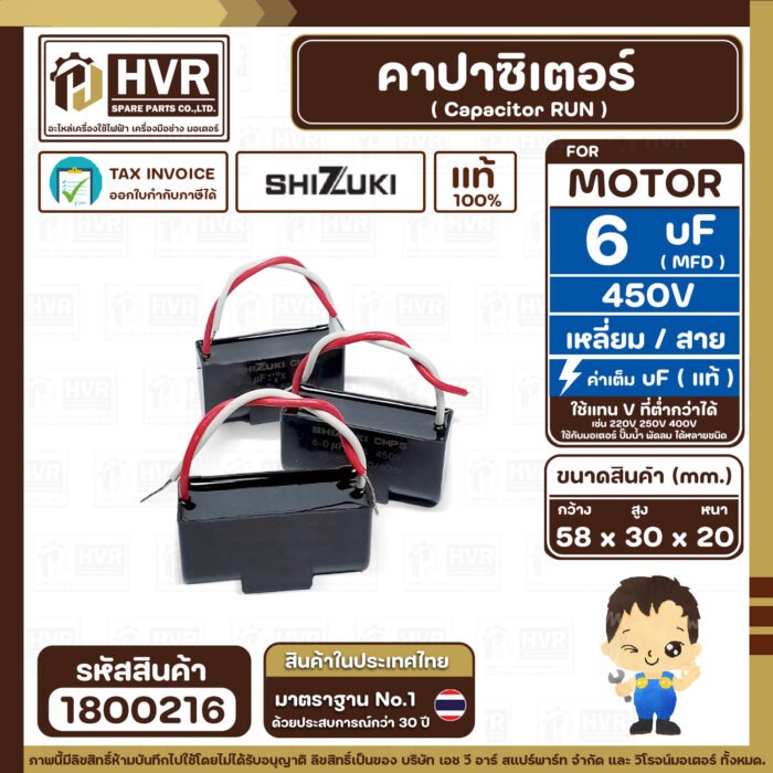 คาปาซิเตอร์ ( Cap Run ) 6 uF 450V ( เหลี่ยม สาย ) ( SHIZUKI ) ( แท้ ) ( 30 x 58 x 20 mm.) ( 1 ตัว ) #1800216