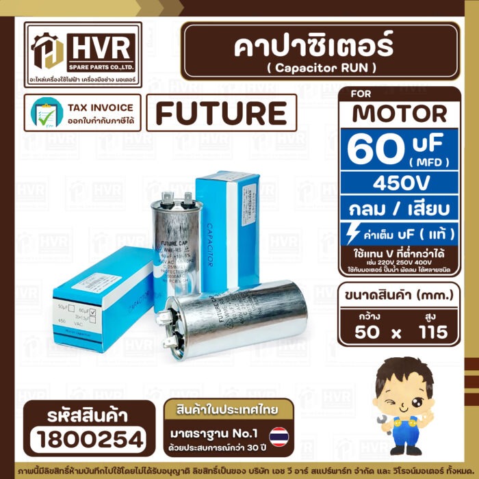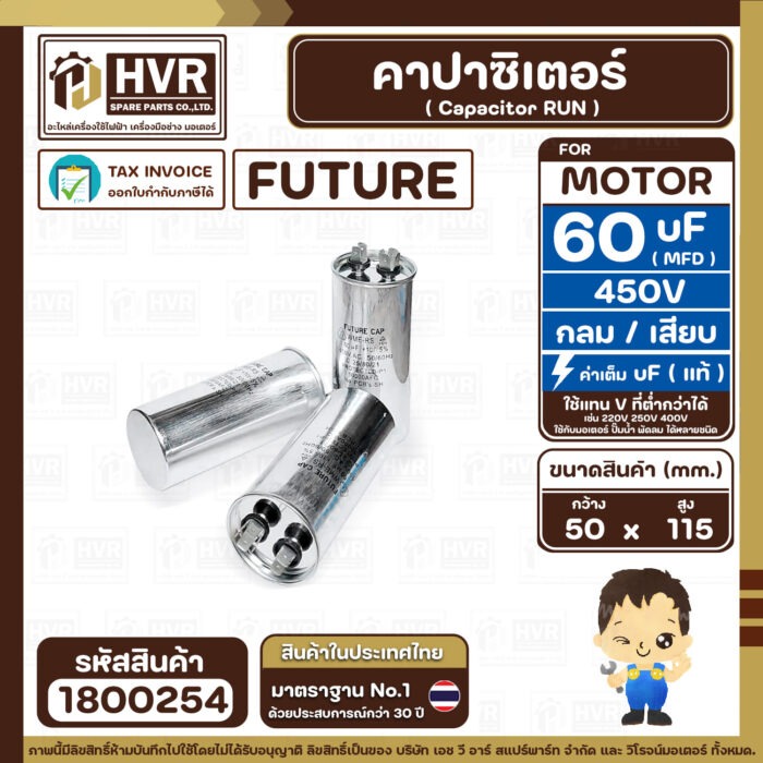 คาปาซิเตอร์ ( Cap Run ) 60 uF 450V ( อลูมิเนียม ) ( กลม เสียบ ) ( FUTURE ) ( 50 x 115 mm.) ( 1 ตัว ) #1800254