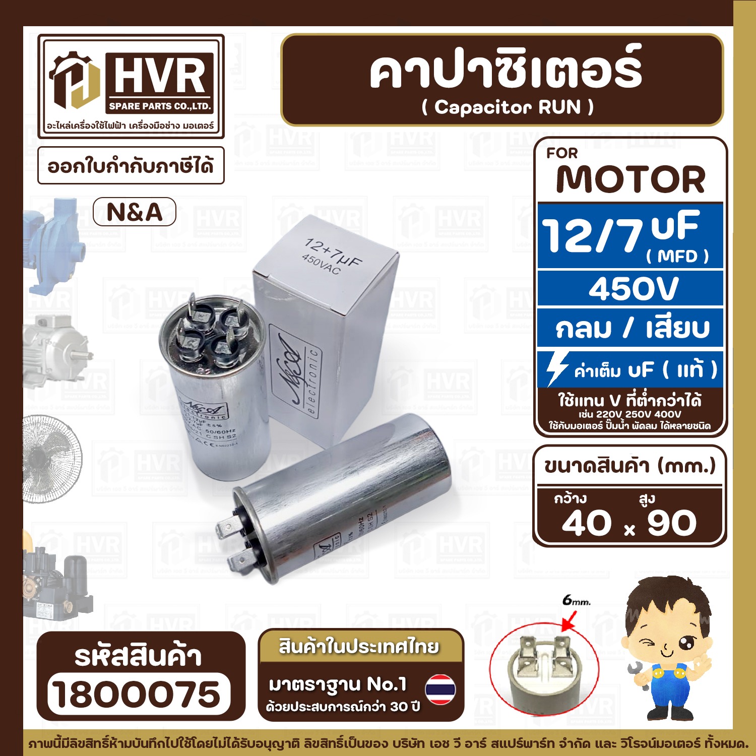 คาปาซิเตอร์ ( Cap Run ) 7 uF + 12 uF 450V ( กลม แบบเสียบ ) ( อลูมิเนียม ) ( N&A ) ( 40 x 90 mm. ) ( 1 ตัว ) #1800075