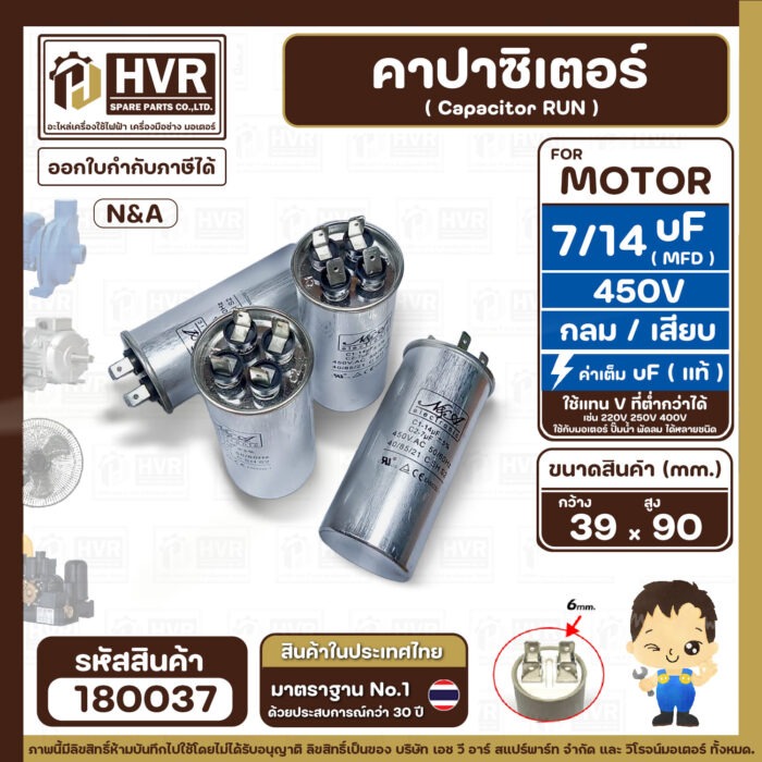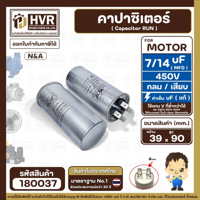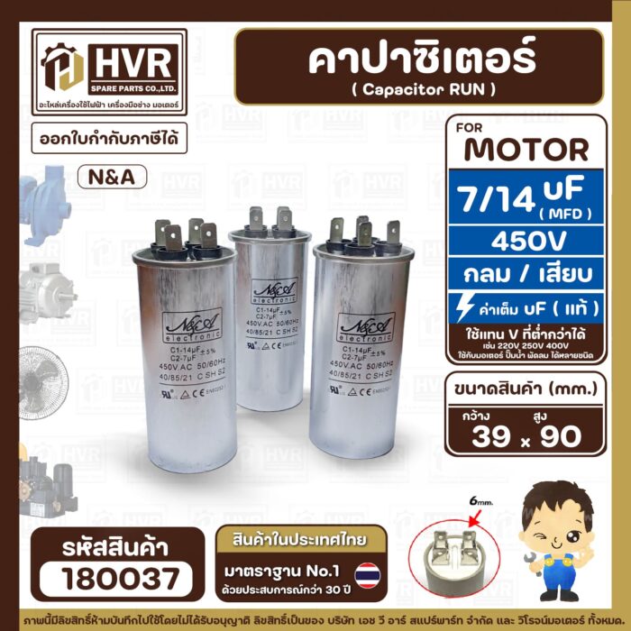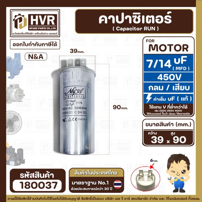 คาปาซิเตอร์ ( Cap Run ) 7 uF + 14 uF 450V ( กลม แบบเสียบ ) ( อลูมิเนียม ) ( N&A ) ( 39 x 90 mm. ) ( 1 ตัว ) #180037