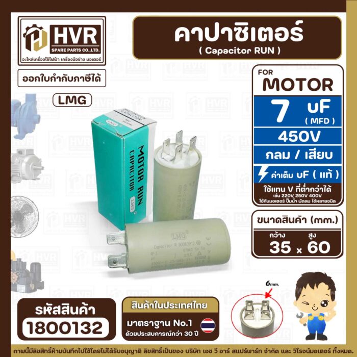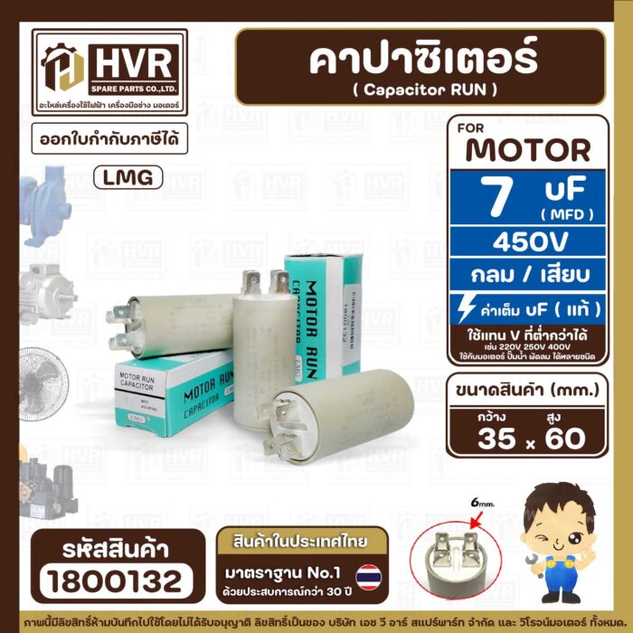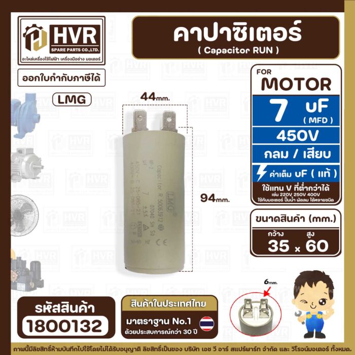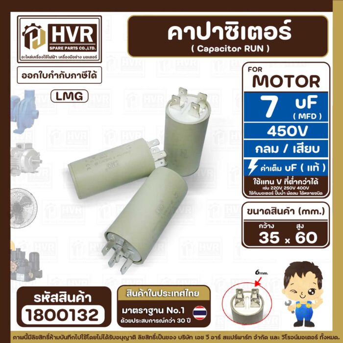 คาปาซิเตอร์ ( Capacitor Run) 7 uF (MFD) 450V ยี่ห้อ LMG ( แท้ ) ( กลม แบบเสียบ 4 ขั่ว ) ( 35 x 60 mm.) #1800132