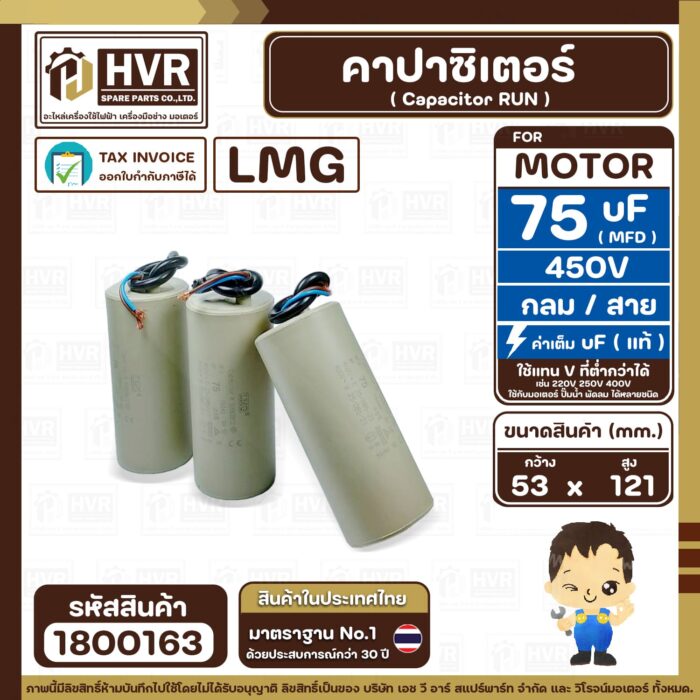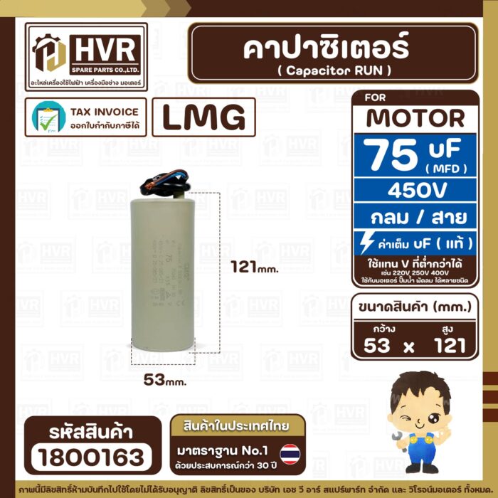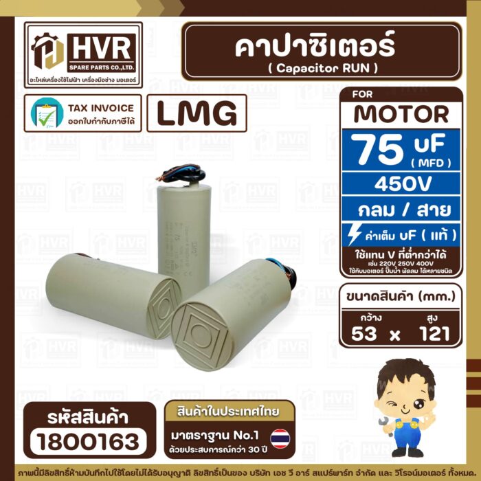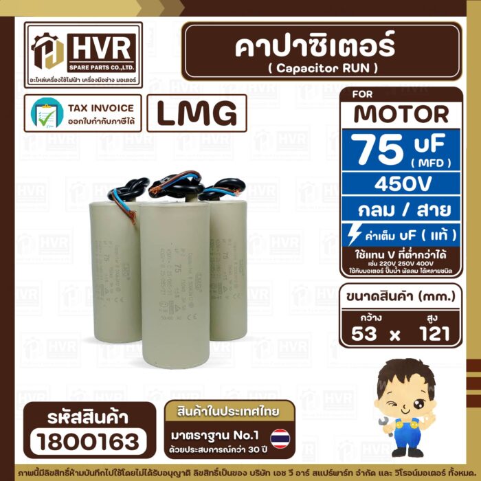คาปาซิเตอร์ ( Cap Run ) 75 uF ( MFD ) 450V ( กลม สาย ) ( LMG ) ( 53 x 121 mm.) #1800163