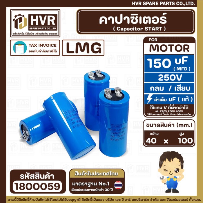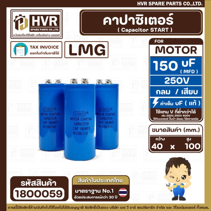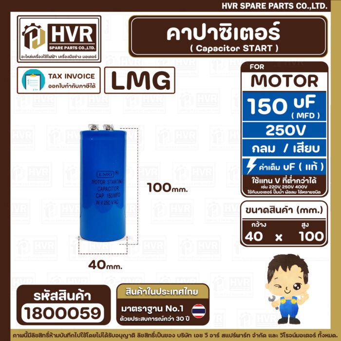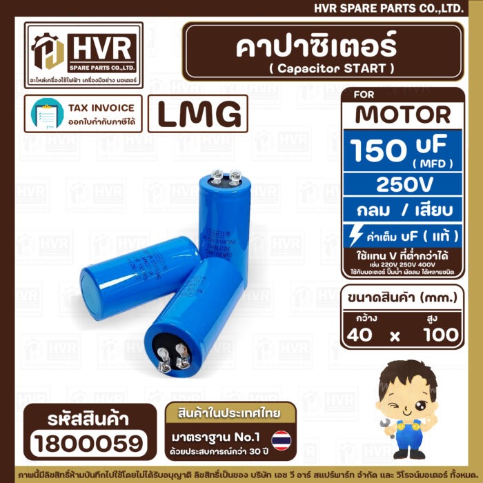 คาปาซิเตอร์ ( Cap Start ) 150 uF 250 V ( กลม ขันน็อต ) ( LMG ) ( 45 x 100 mm.) ( 1 ตัว )