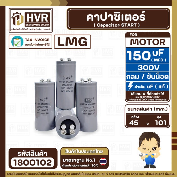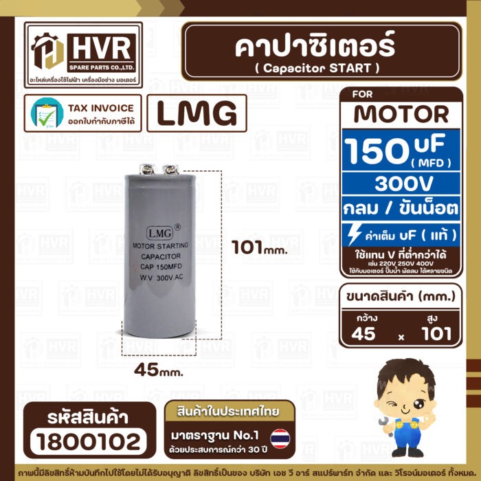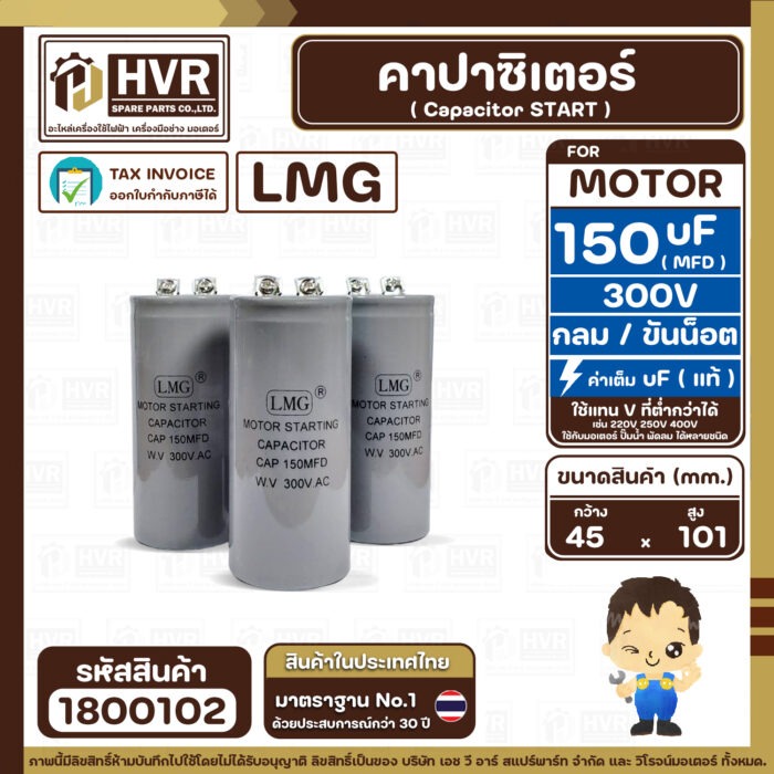 คาปาซิเตอร์ ( Cap Start ) 150 uF 300 V ( กลม ขันน็อต ) ( LMG ) ( 45 x 101 mm.) ( 1 ตัว )