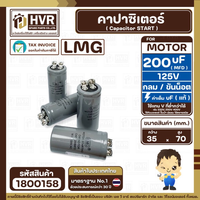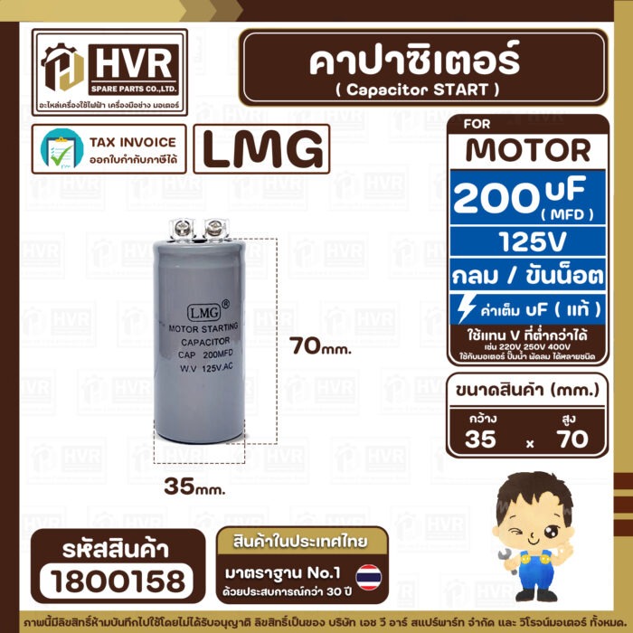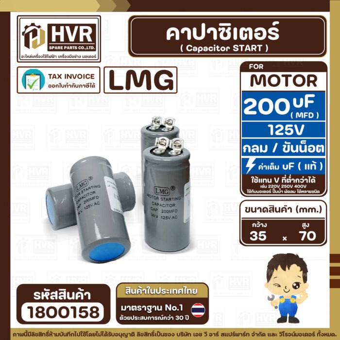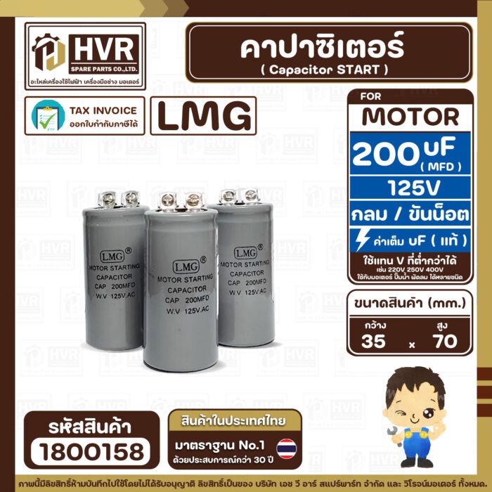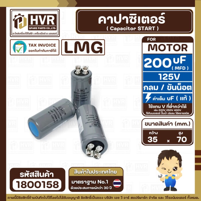 คาปาซิเตอร์ ( Cap Start ) 200 uF 125V ( กลม ขันน็อต) ( LMG ) ( 35 x 70 mm.) ( 1 ตัว ) #1800158