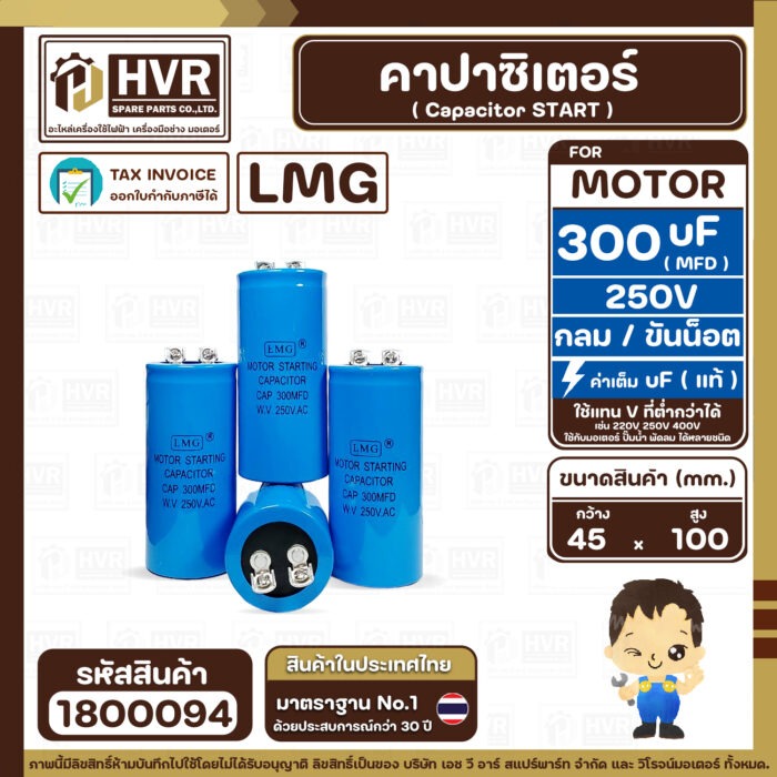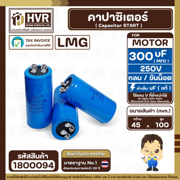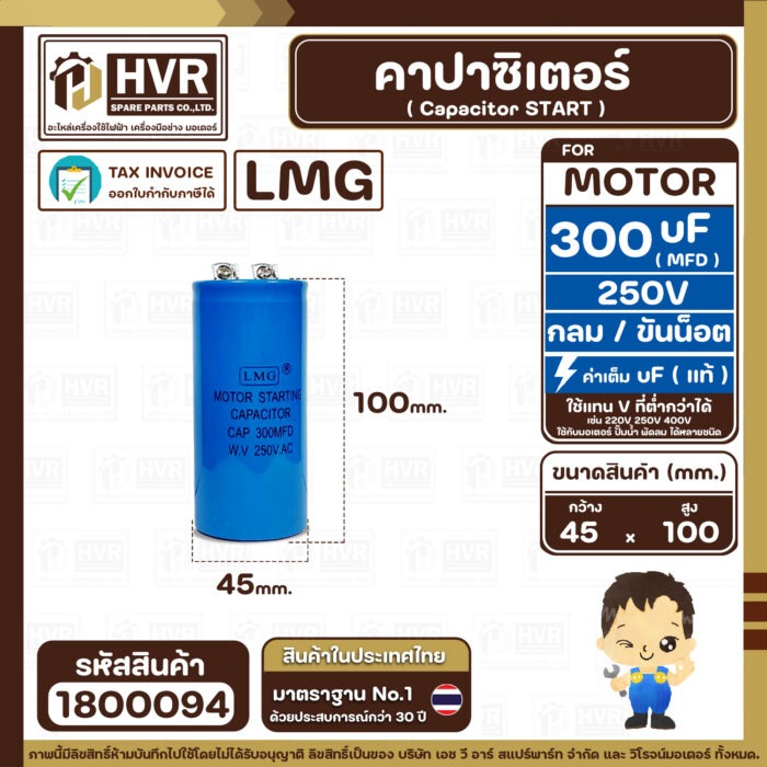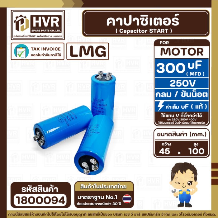 คาปาซิเตอร์ ( Cap Start ) 300 uF 250 V ( กลม ขันน็อต ) ( LMG ) ( 45 x 100 mm.) ( 1 ตัว )