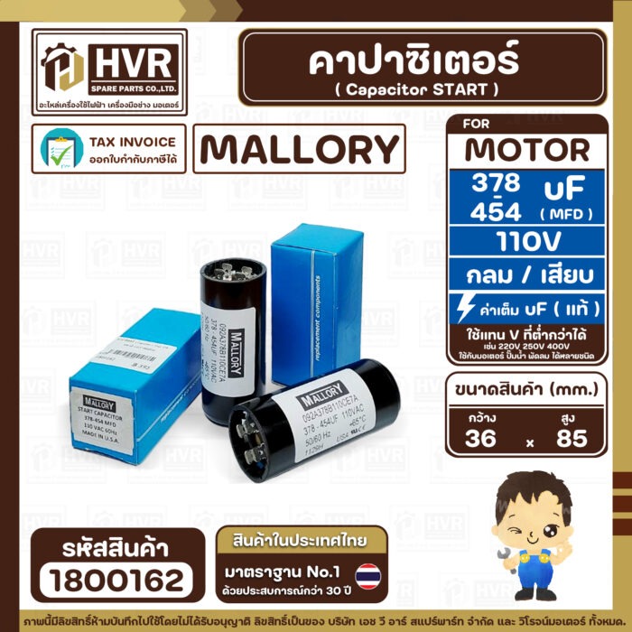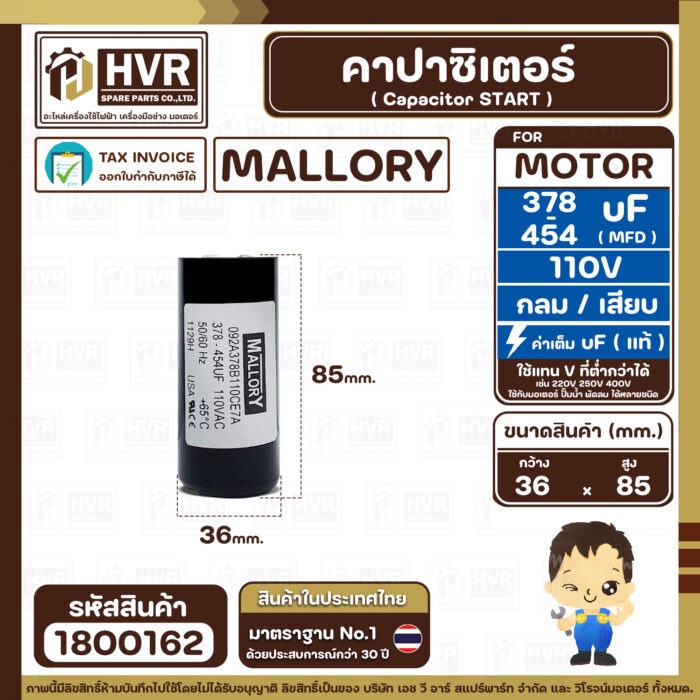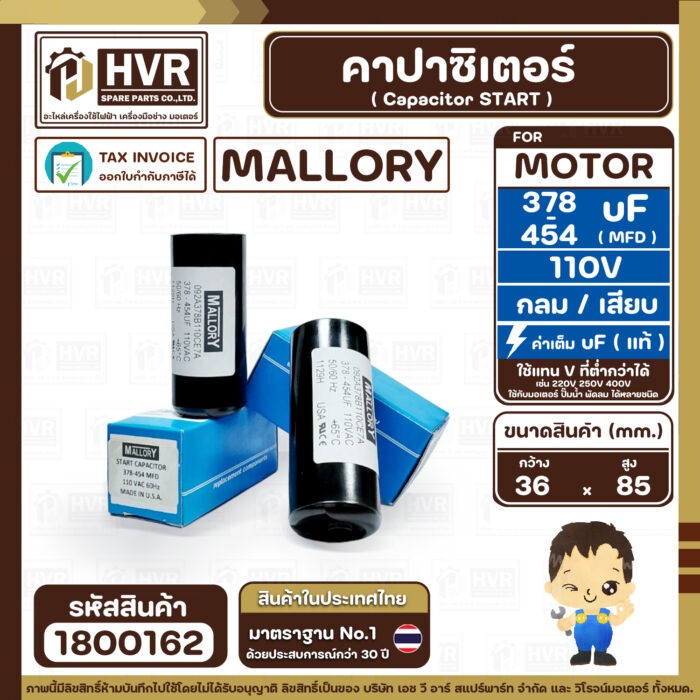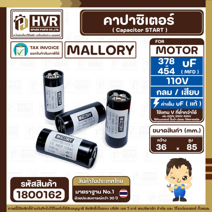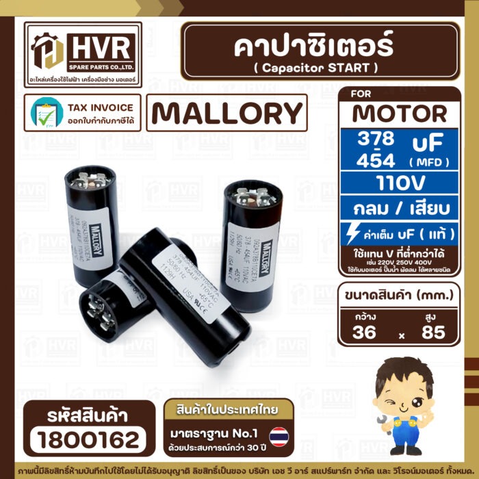 คาปาซิเตอร์ ( Cap Start ) 378 uF- 454 uF 110V ( กลม ขันน็อต) ( Mallory ) ( 36 x 85 mm.) ( 1 ตัว )
