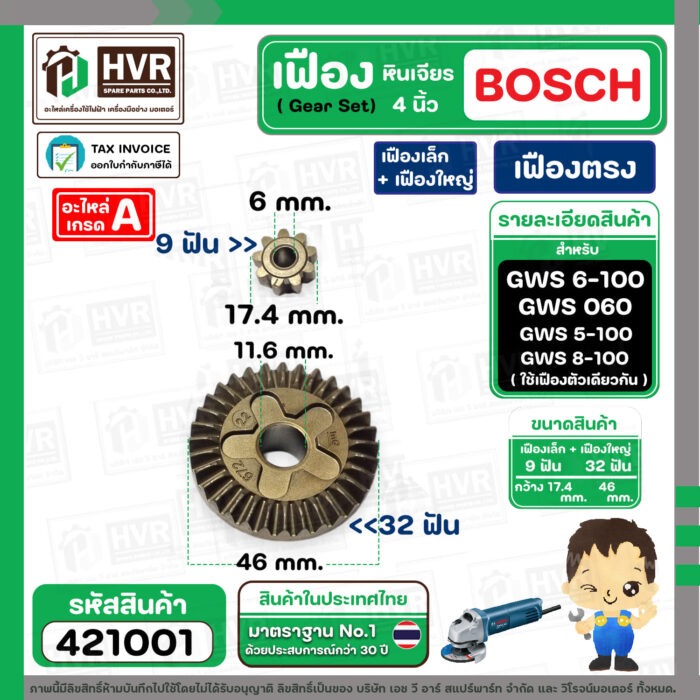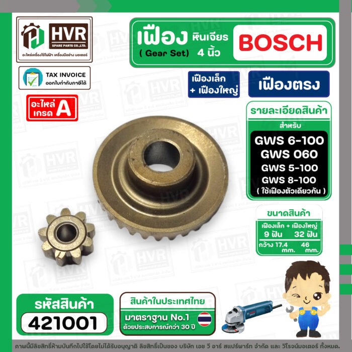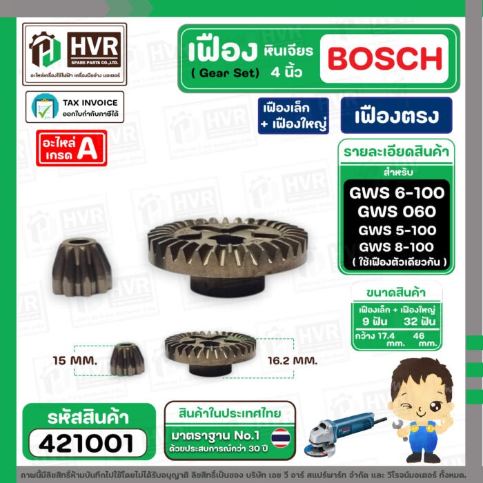 ชุดเฟืองหินเจียร BOSCH GWS 6-100 , GWS 5-100 , GWS 8-100 , GWS 060 ( Set เฟืองเล็ก + ใหญ่ ) ( เฟืองตรง ) #421001