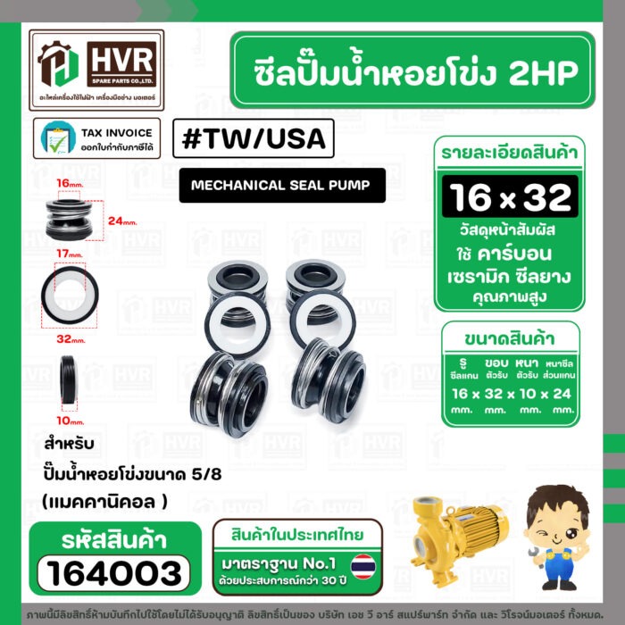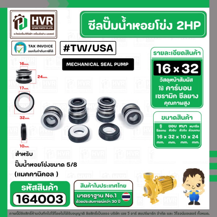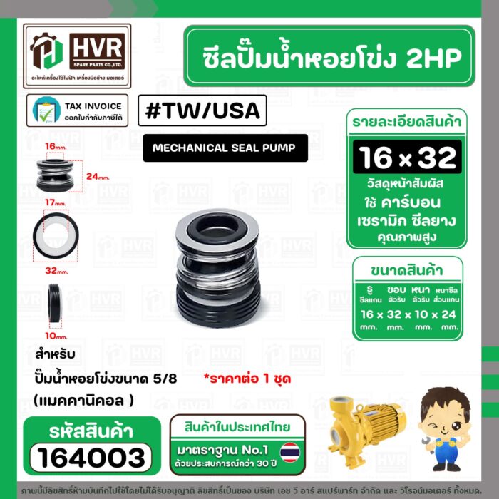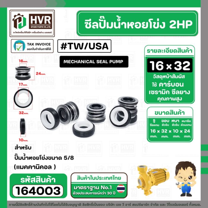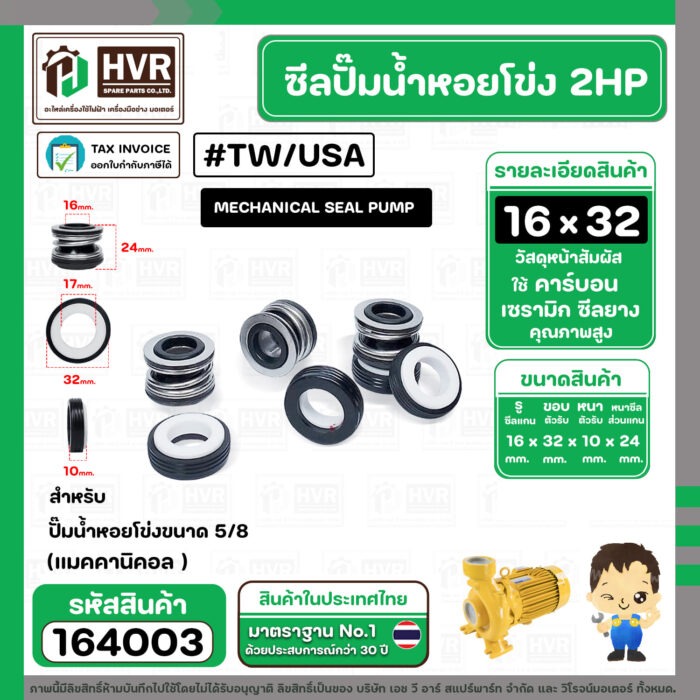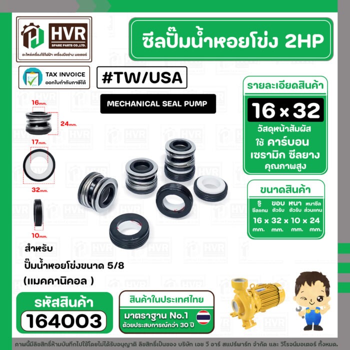 ซีลปั้มน้ำหอยโข่ง 2 HP ขนาด 5/8 ” ( 16 x 32 mm.) ( แมคคานิคอล ซีล) ( ARENO , PIRALI ) #TW/USA ( 1 ตัว ) #164003