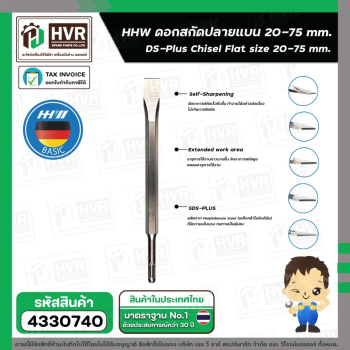 HHW ดอกสกัดปลายแบน ขนาด 20 มม.ยาวรวม 250 มม. / SDS-Plus Chisel Flat size 20 mm. Complete Length 250 mm