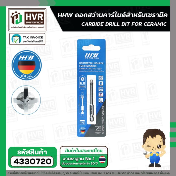 ดอกสว่านเจาะกระเบื้อง 6 mm.( แกนดอกไขควง 1/4 ” ) ( HHW ) #10.101100 #4330720
