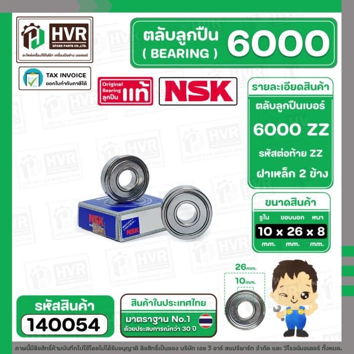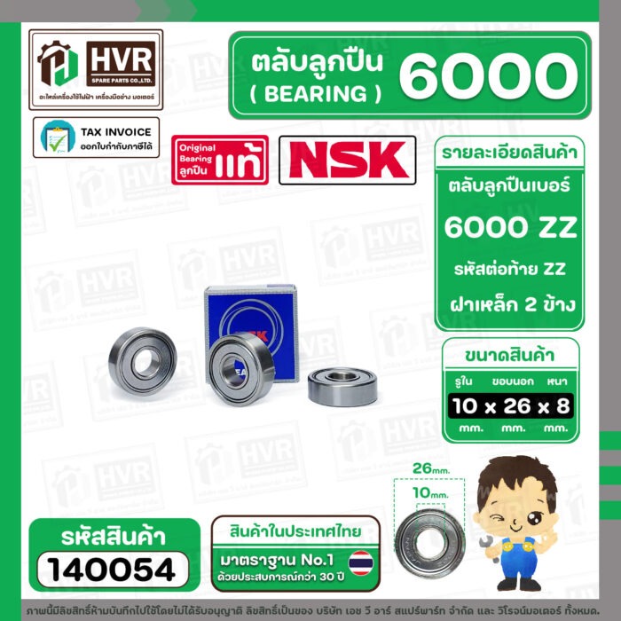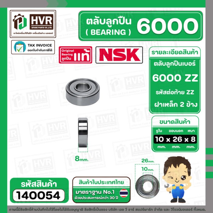 ตลับลูกปืน ( bearing ) 6000 ZZ ( ฝาเหล็ก ) ยี่ห้อ NSK คุณภาพดี มาตราฐาน JAPAN ( 10 x 26 x 8 MM ) ( ราคา / 1 ตลับ ) #140054