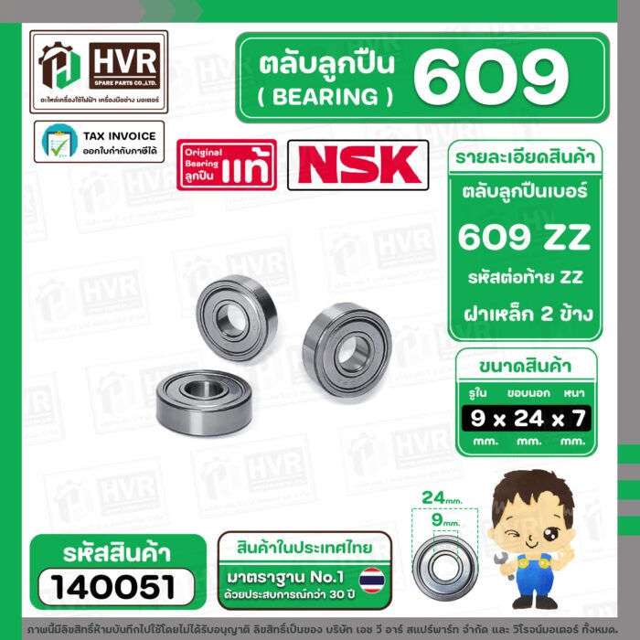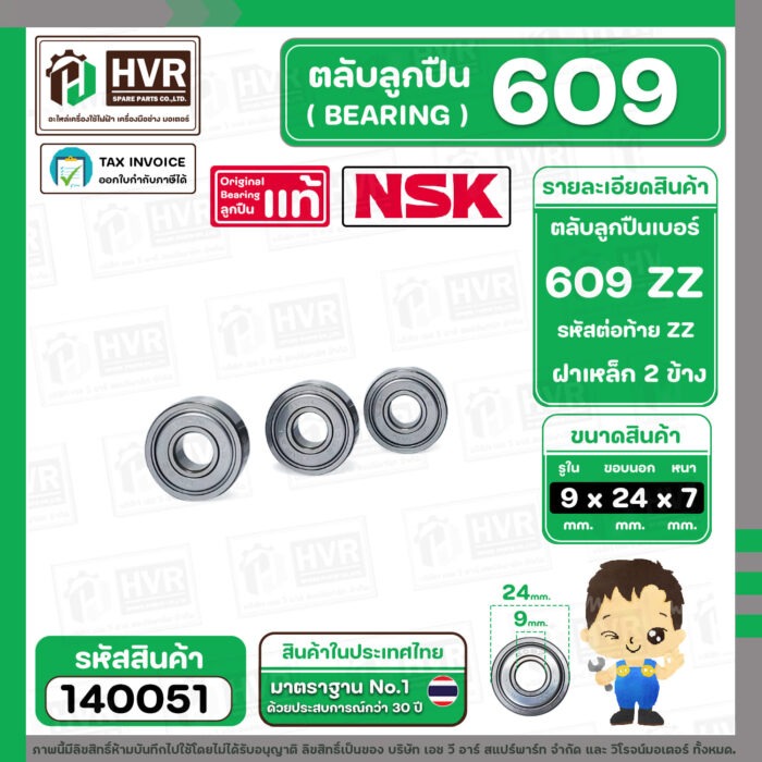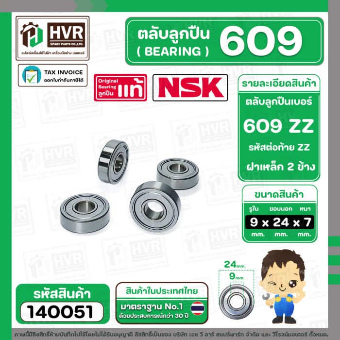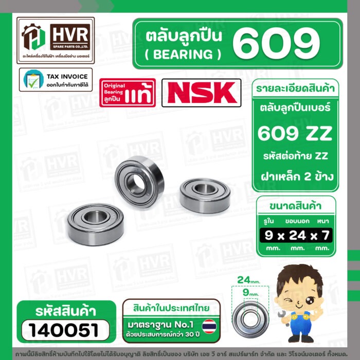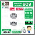 ตลับลูกปืน ( bearing ) 609 ZZ ( ฝาเหล็ก ) ยี่ห้อ NSK คุณภาพดี มาตราฐาน JAPAN ( 9 x 24 x 7 mm. ) ( ราคา / 1 ตลับ ) #140051