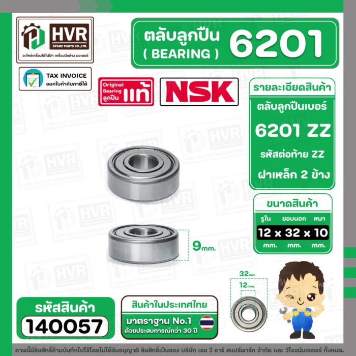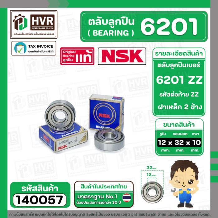 ตลับลูกปืน ( bearing ) 6201 ZZ ( ฝาเหล็ก ) ยี่ห้อ NSK คุณภาพดี มาตราฐาน JAPAN ( 12 x 32 x 10 mm. )( ราคา / 1 ตลับ ) #140057