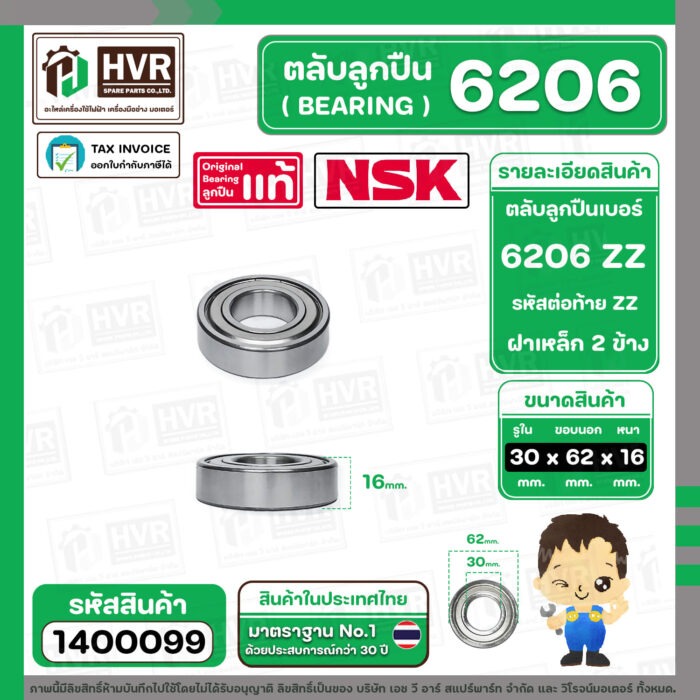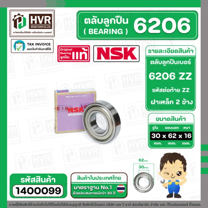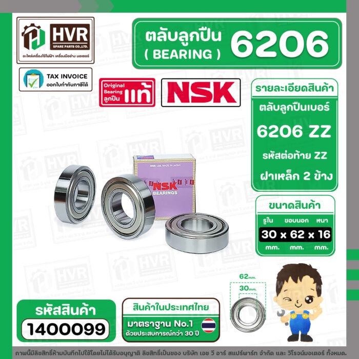 ตลับลูกปืน ( bearing ) 6206 ZZ ( ฝาเหล็ก ) ยี่ห้อ NSK คุณภาพดี มาตราฐาน JAPAN ( 30 x 62 x 16 mm. ) ( ราคา / 1 ตลับ ) #1400099