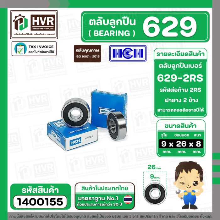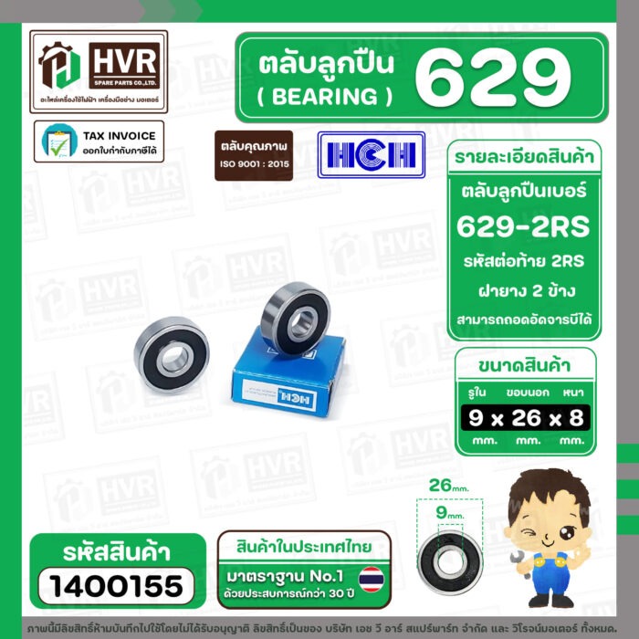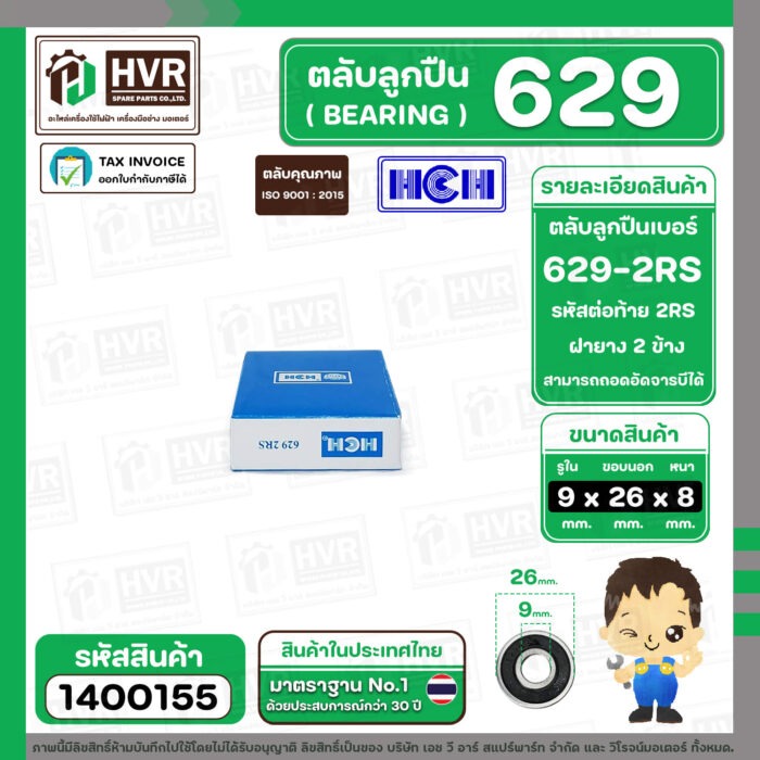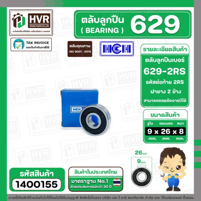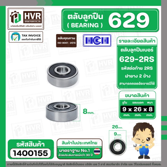 ตลับลูกปืน ( bearing ) 629 2RS ( ฝายาง ) HCH ( 9 x 26 x 8 mm. ) ( ราคา / 1 ตลับ ) #1400155